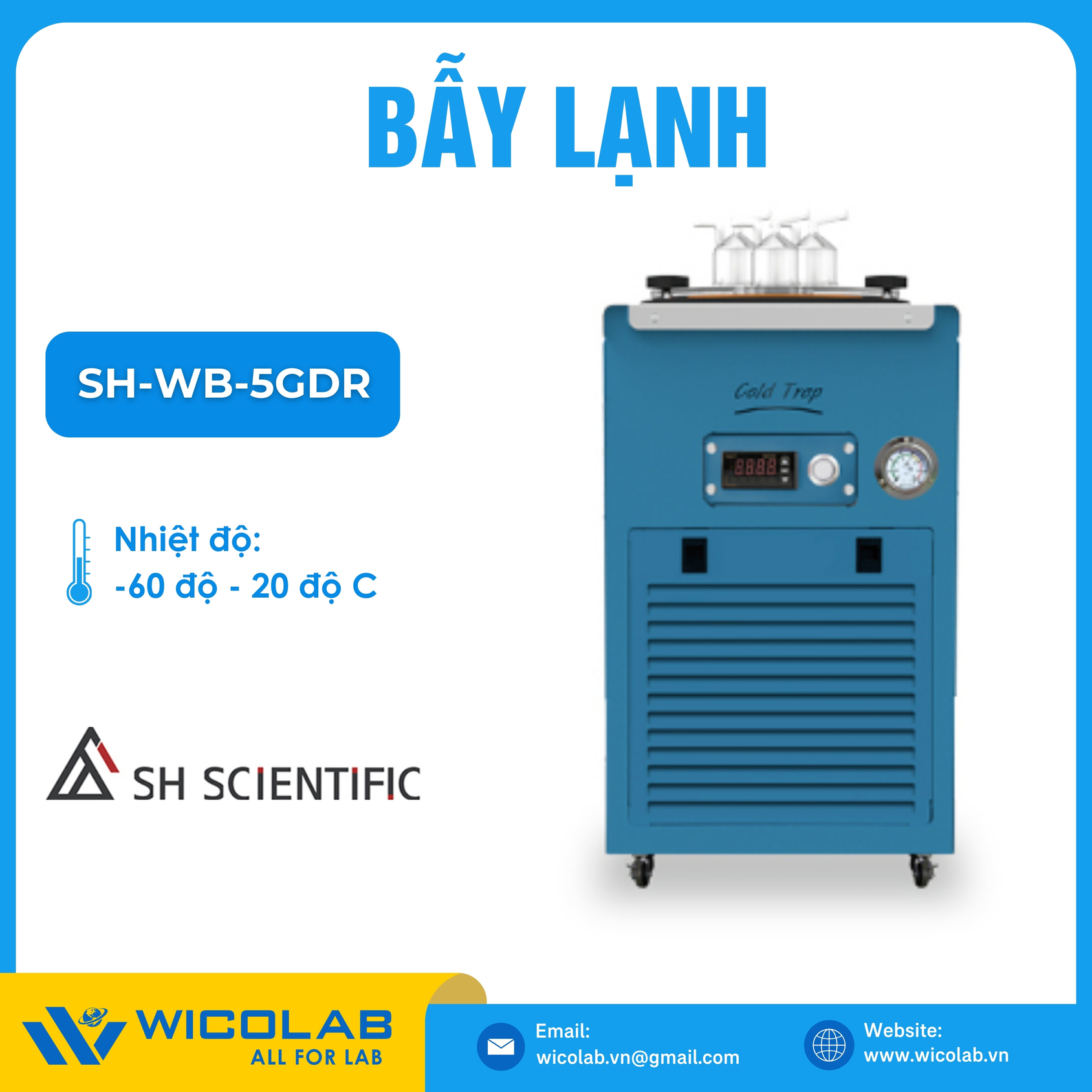 SH-WB-5GDR(-40 độ) 🌟 Bẫy Lạnh - Cold Trap có giới hạn nhiệt độ thấp nhất là âm 40 độ C. Tủ được thiết kế và chế tạo bởi hãng SH Scientific - Hàn Quốc. Tủ có bộ điều khiển kỹ thuật số vi xử lý thuận tiện để kiểm tra trạng thái nhiệt độ tủ. Sản phẩm được nhập khẩu và phân phối chính hãng bởi WICOLAB. Bảo hành lên tới 12 tháng. Hỗ trợ giao hàng toàn quốc.