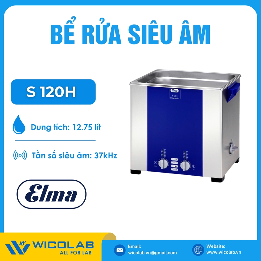 S120H ⭐ Bể rửa siêu âm có gia nhiệt dung tích 12.75 lít, công suất siêu âm 200W. Bể được ứng dụng rộng rãi trong y tế, nha khoa, phòng thí nghiệm. Sản phẩm do hãng Elma- Đức sản xuất, được nhập khẩu và phân phối chính hãng bởi Wicolab. Bảo hành 12 tháng