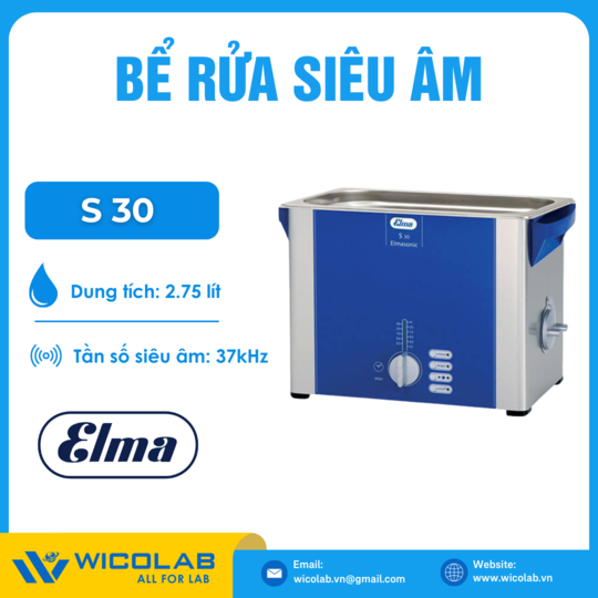 S 30 ⭐ Bể rửa siêu âm không gia nhiệt dung tích 2.75 lít, công suất siêu âm 80W. Bể được ứng dụng rộng rãi trong y tế, nha khoa, phòng thí nghiệm. Sản phẩm do hãng Elma - Đức sản xuất, được nhập khẩu và phân phối chính hãng bởi Wicolab. Bảo hành 12 tháng