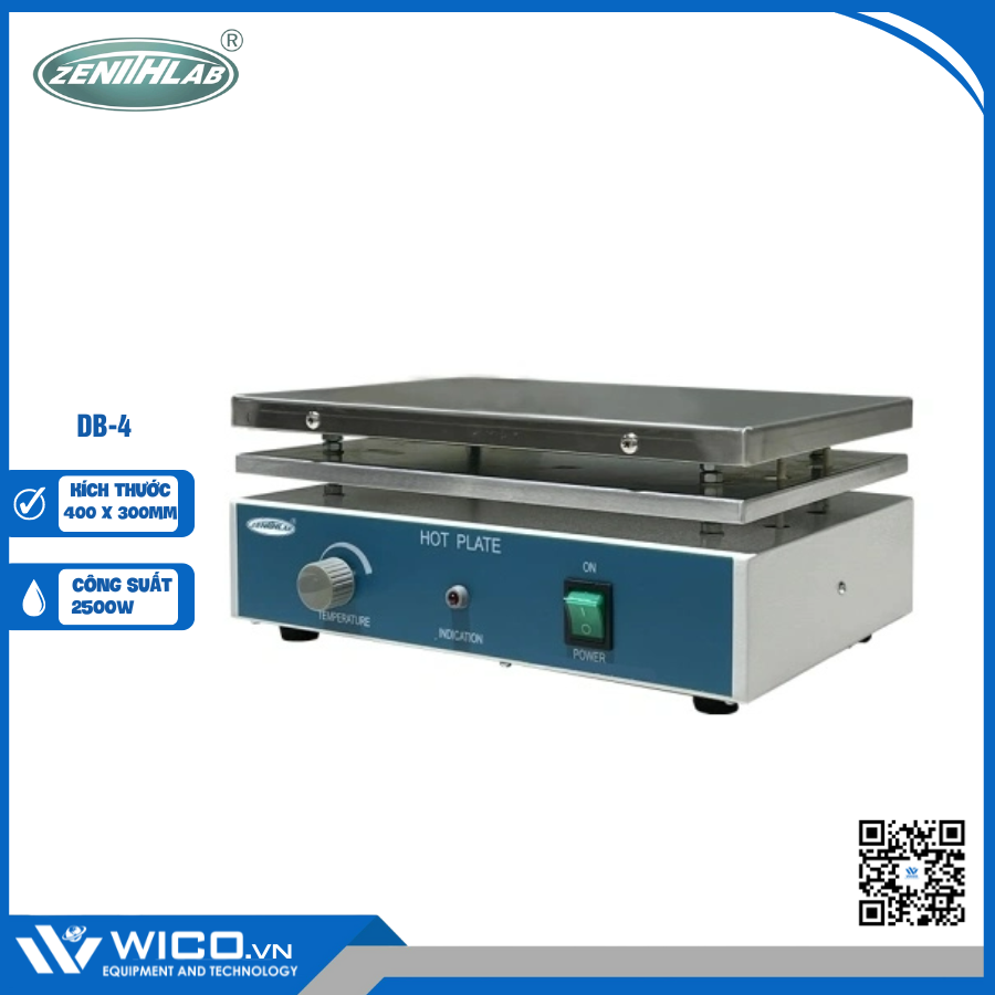 Bếp gia nhiệt - Hot plate DB-4 🌟 Mặt gia nhiệt 400x200mm. Bộ điều khiển kiểu cơ núm vặn - Tối ưu chi phí. Hàng chính hãng Zenith Lab Trung Quốc. Được nhập khẩu và phân phối chính hãng bởi Wico Việt Nam. Bảo hành 12 tháng. Hỗ trợ giao hàng trên toàn quốc