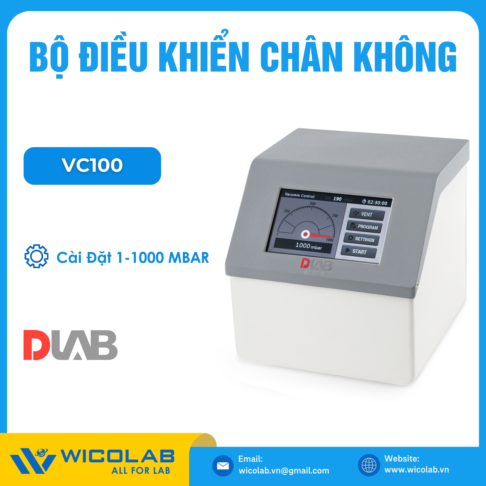 - VC100 là Bộ điều khiển áp suất chân không chuyên dụng máy cô quay chân không, sản phẩm chính hãng Dlab Mỹ. Được nhập khẩu và phân phối chính hãng bởi Thietbiphantich.Vn