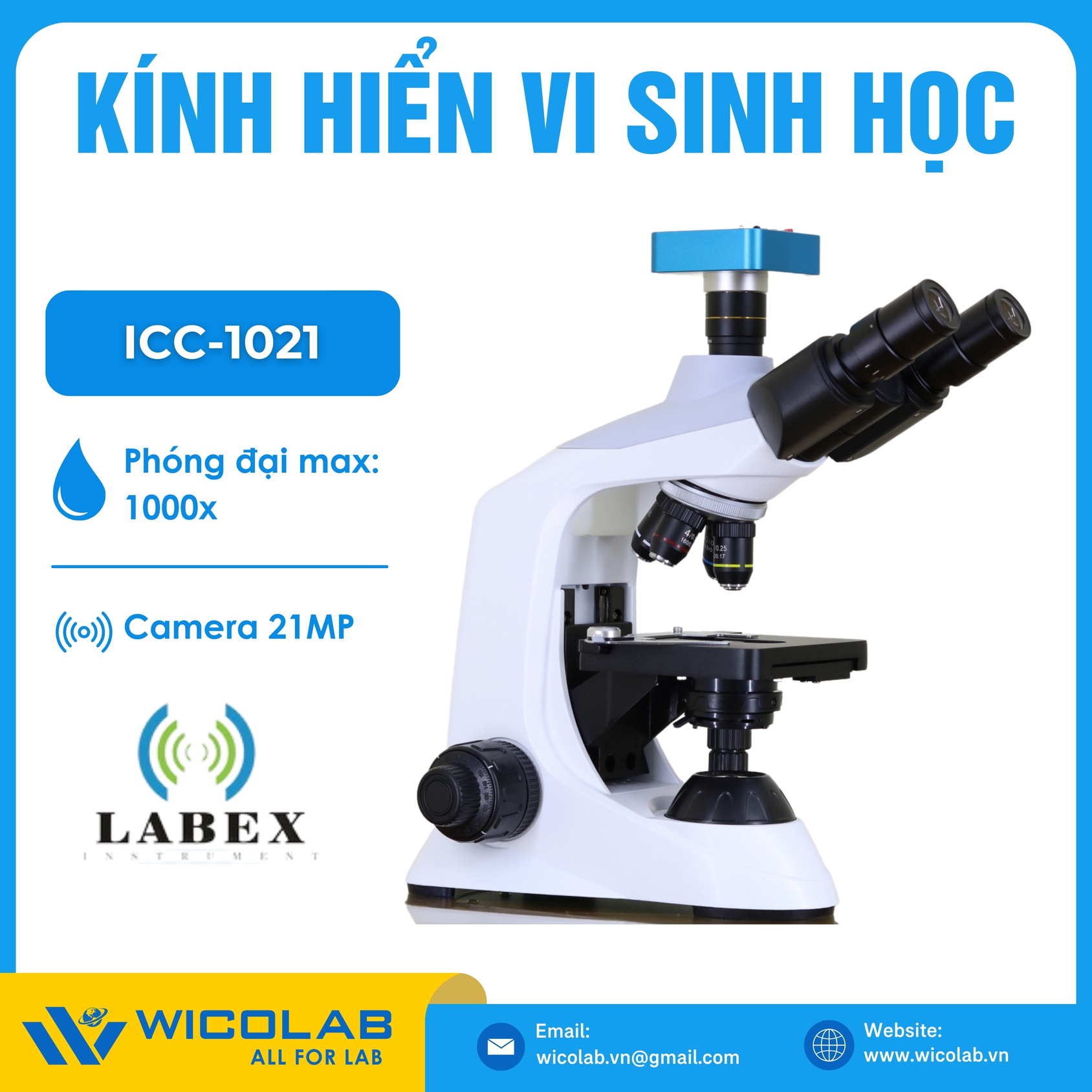 ICC-1021 là Bộ Kính Hiển Vi Sinh Học 3 mắt cao cấp ICO-T1000PL kèm Camera Chuyên Dụng CCD-21MP do hãng Labex - Anh Quốc sản xuất. Sản phẩm được nhập khẩu và phân phối chính hãng bởi WICOLAB