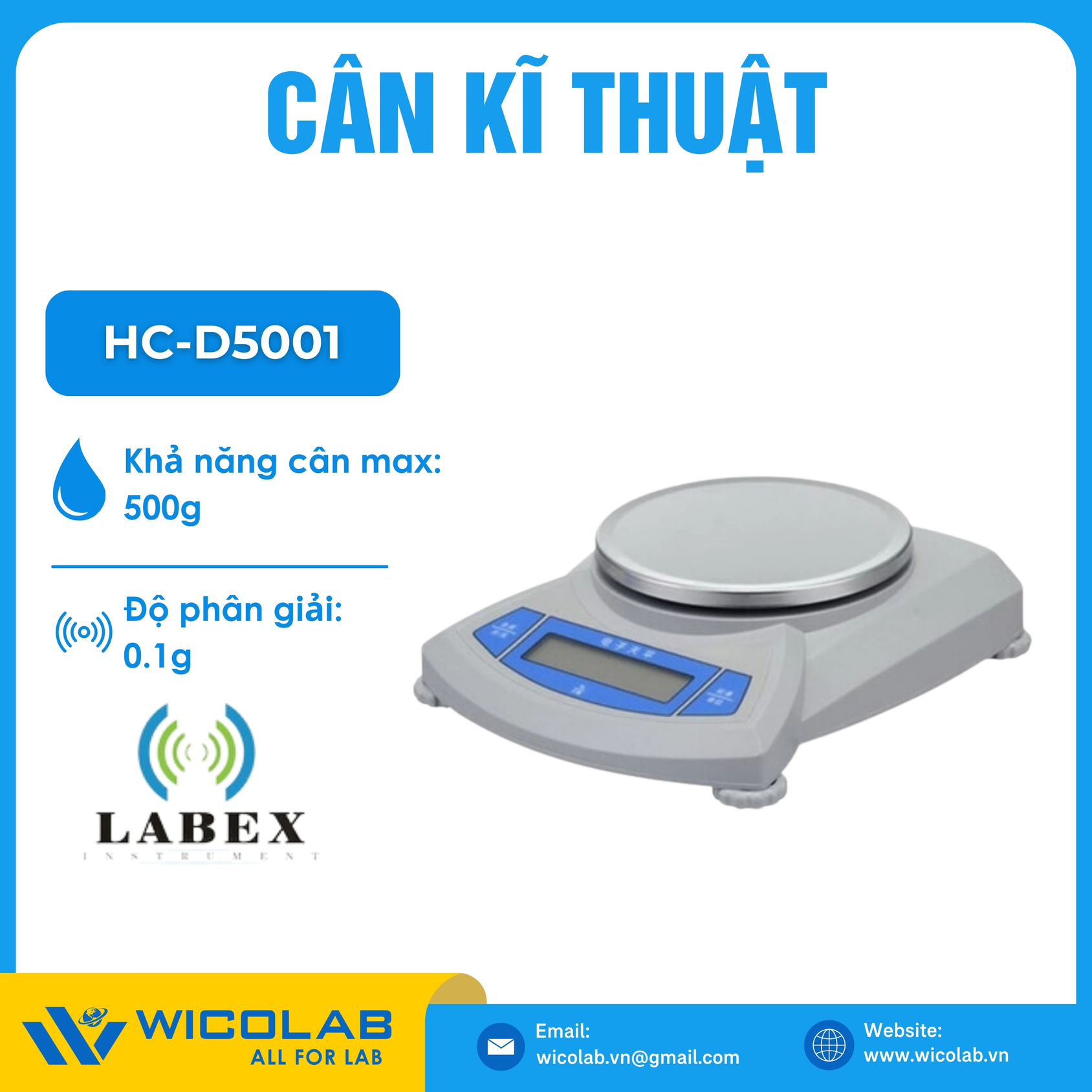 HC-D5001 ⭐ Cân kỹ thuật 1 số lẻ với khả năng cân tối đa 500g và độ phân giải 0.1g cùng màn hình LCD. Sản phẩm do hãng Labex Anh thiết kế và chế tạo, được nhập khẩu và phân phối chính hãng bởi WICOLAB. Bảo hành 12 tháng