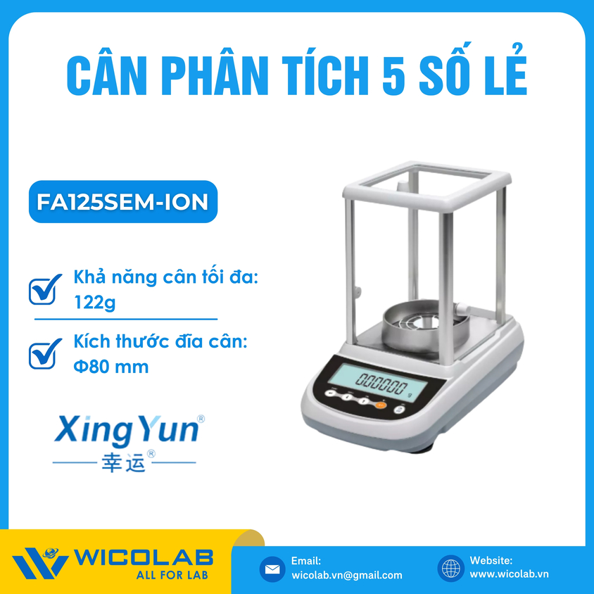 FA125SEM-ION ⭐ Cân phân tích 5 số lẻ với khả năng cân tối đa 122g. Trang bị bộ khử tĩnh điện Ion giúp cho ra kết quả cân ổn định và chính xác. Được sản xuất và chế tạo bởi hãng Xingyun – Trung Quốc. Sản phẩm được nhập khẩu và phân phối bởi Wicolab. Cam kết 100% sản phẩm chính hãng. Bảo hành lên tới 12 tháng.