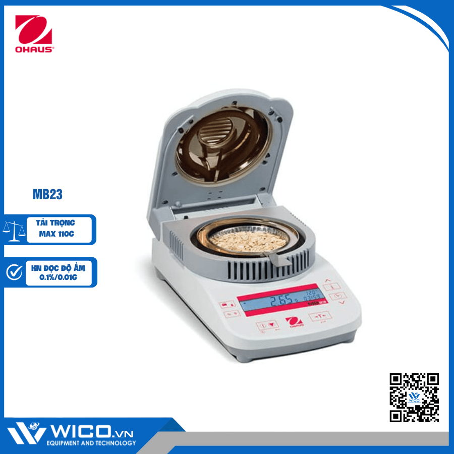 MB23 🌟 cân sấy ẩm trang bị bộ phận gia nhiệt hồng ngoại có khả năng cân tối đa 110g thuộc dòng máy phân tích độ ẩm do hãng Ohaus – Mỹ thiết kế và chế tạo. Được nhập khẩu và phân phối chính hãng bởi Wico Việt Nam. Bảo hành sản phẩm trong vòng 12 tháng