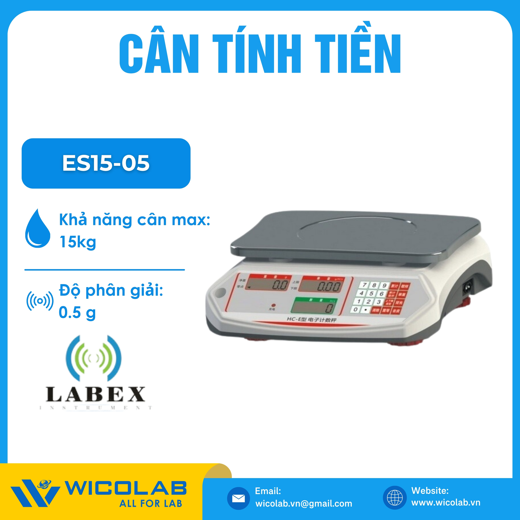 ES15-05 ⭐ Cân tính tiền có khả năng cân tối đa 15kg với độ chính xác 0.5g, có 3 cột hiển thị riêng biệt, rõ ràng: Khối lượng - Đơn giá - Thành tiền cho phép người sử dụng có thể cân và tính tiền nhanh chóng và chính xác. Sản phẩm do hãng Labex Anh thiết kế và chế tạo, được nhập khẩu và phân phối chính hãng bởi WICOLAB. Bảo hành 12 tháng