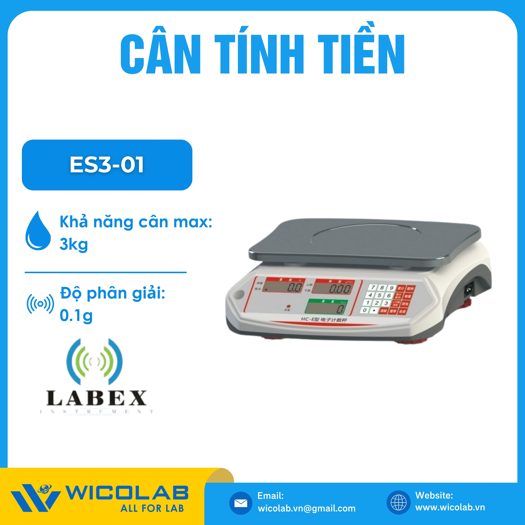 ES3-01 ⭐ Cân tính tiền có khả năng cân tối đa 3kg với độ chính xác 0.1g, có 3 cột hiển thị riêng biệt, rõ ràng: Khối lượng - Đơn giá - Thành tiền cho phép người sử dụng có thể cân và tính tiền nhanh chóng và chính xác. Sản phẩm do hãng Labex Anh thiết kế và chế tạo, được nhập khẩu và phân phối chính hãng bởi WICOLAB. Bảo hành 12 tháng