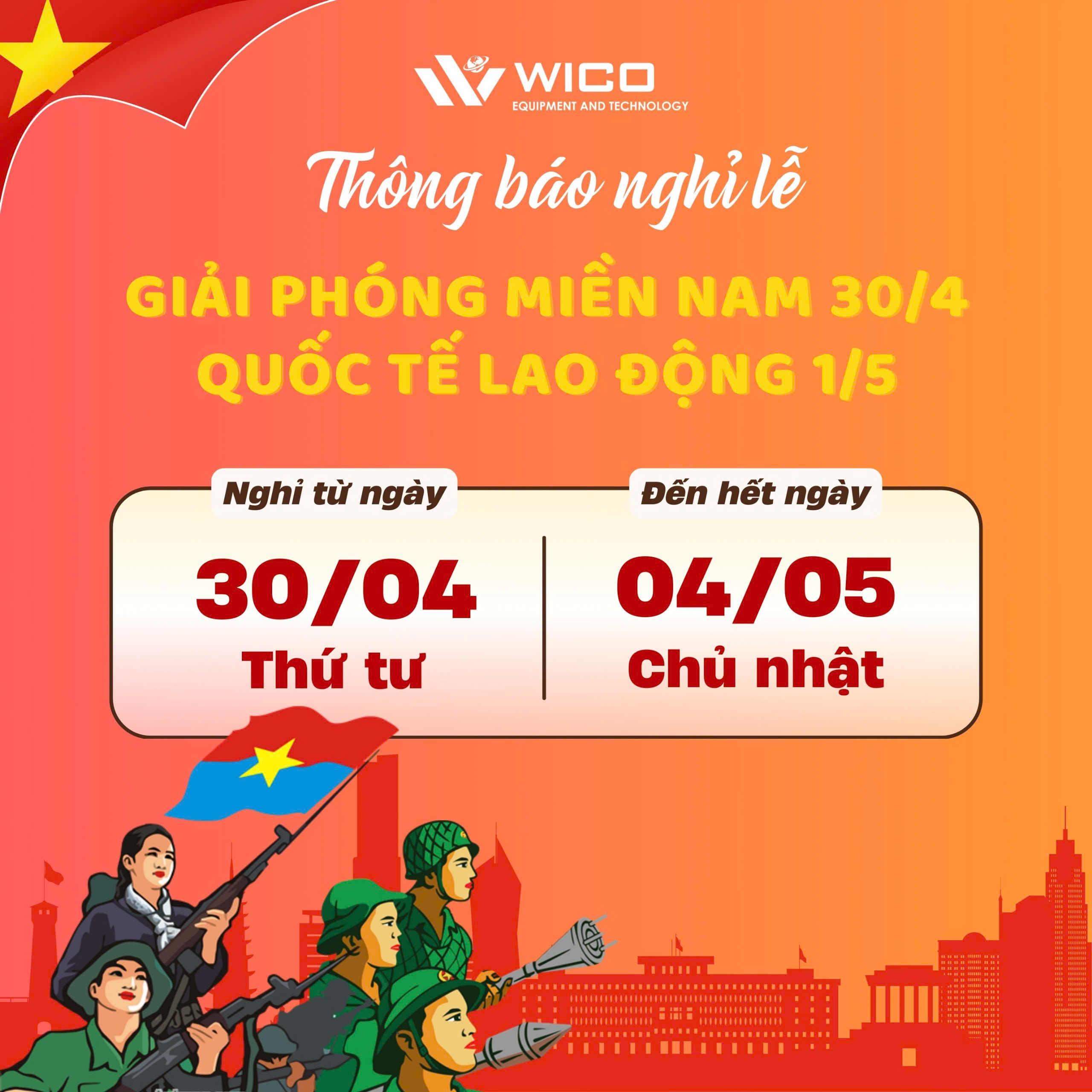 🎉 Nhân dịp này, Wico xin kính chúc Quý Khách hàng, Quý Đối tác và toàn thể Nhân viên một kỳ nghỉ lễ vui vẻ – an toàn – hạnh phúc bên gia đình và người thân.