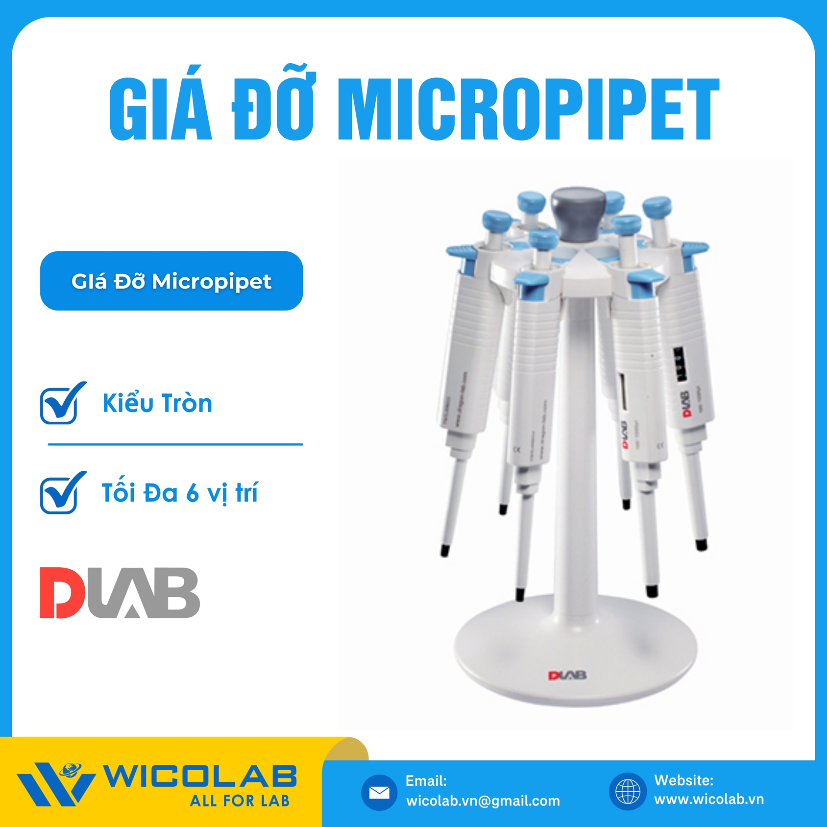 - Giá Để Micropipet - Kiểu tròn, tối đa để 6 Micropipet, sản phẩm chính hãng Dlab Mỹ. Được nhập khẩu và phân phối chính hãng bởi Wico.vn