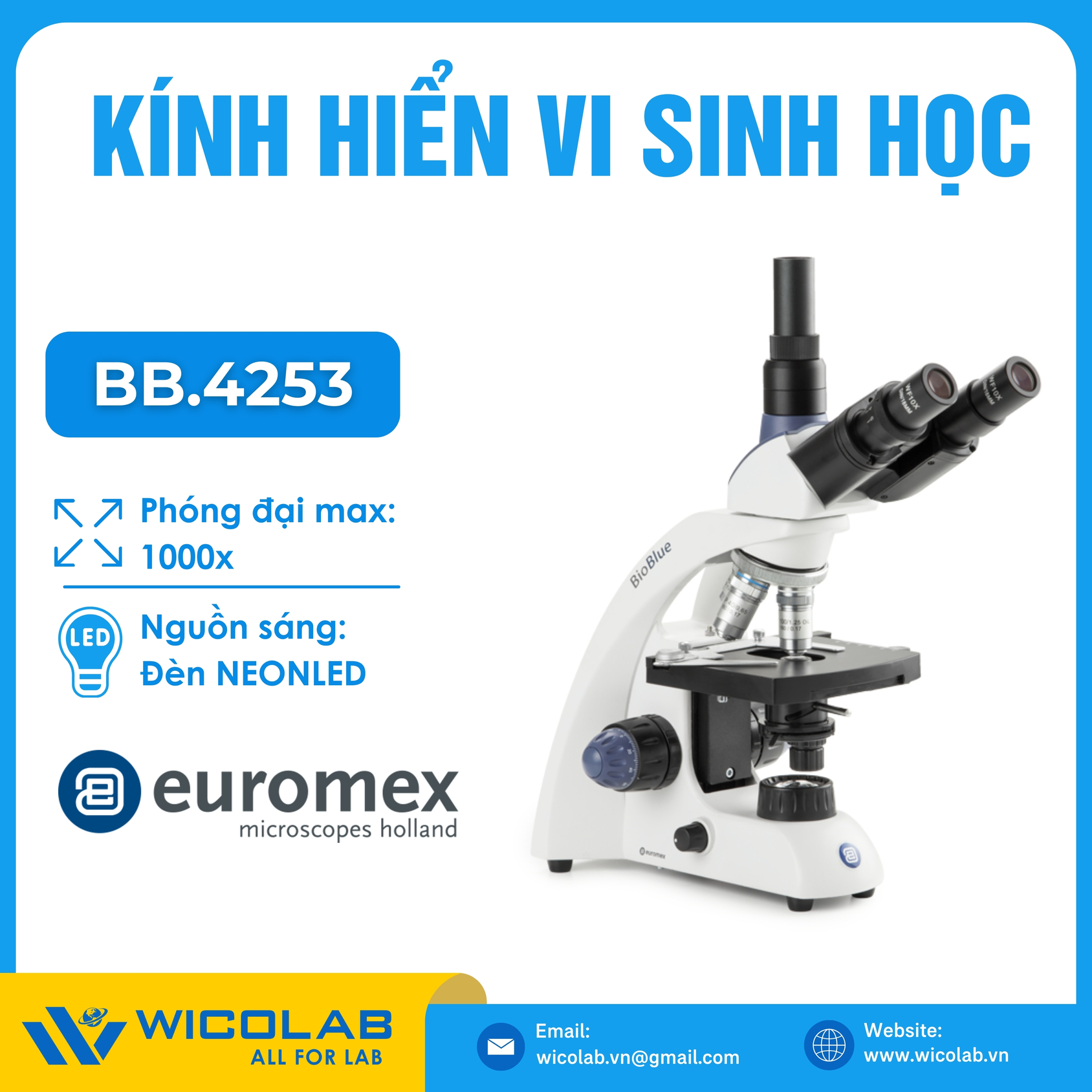 BB.4253 ⭐ Kính hiển vi sinh học 3 mắt có độ phóng đại tối đa 1000 lần khi dùng với thị kính 10X và vật kính 100X. Sản phẩm do hãng Euromex- Hà lan sản xuất, được nhập khẩu và phân phối chính hãng bởi Wico Việt Nam