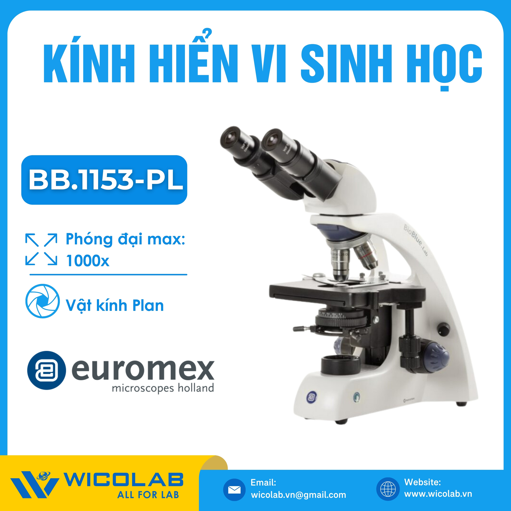 Kính hiển vi sinh học 2 mắt BB.1153PL ⭐ Độ phóng đại tối đa 1000 lần khi sử dụng vật kính 100X và thị kính 10X cho chất lượng hình ảnh sắc nét. Sản phẩm do hãng Euromex Hà Lan sản xuất, được nhập khẩu và phân phối chính hãng bởi WICOLAB