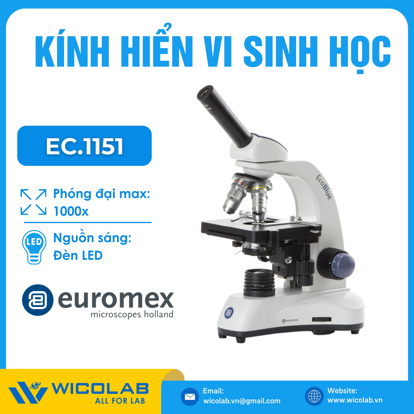 EC.1151 ⭐ Kính hiển vi sinh học 1 mắt với độ phóng đại tối đa 1000 lần khi dùng với thị kính 10X và vật kính 100X. Sản phẩm do hãng Euromex- Hà lan sản xuất, được nhập khẩu và phân phối chính hãng bởi WICOLAB