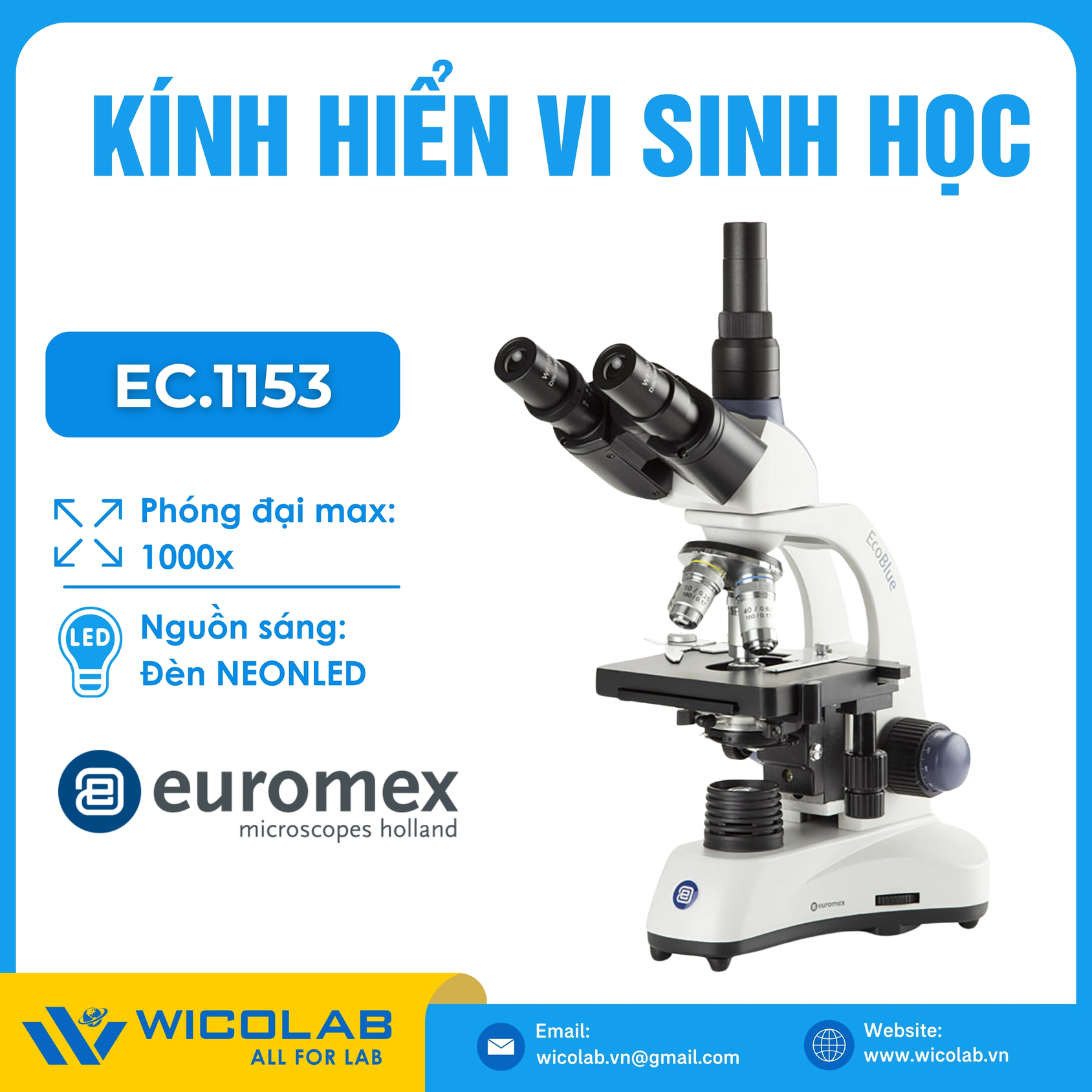 EC.1153 là Kính hiển vi sinh học 3 mắt với độ phóng đại tối đa 1000 lần khi dùng với thị kính 10X và vật kính S100X N.A. Sản phẩm do hãng Euromex- Hà lan sản xuất, được nhập khẩu và phân phối chính hãng bởi WICOLAB