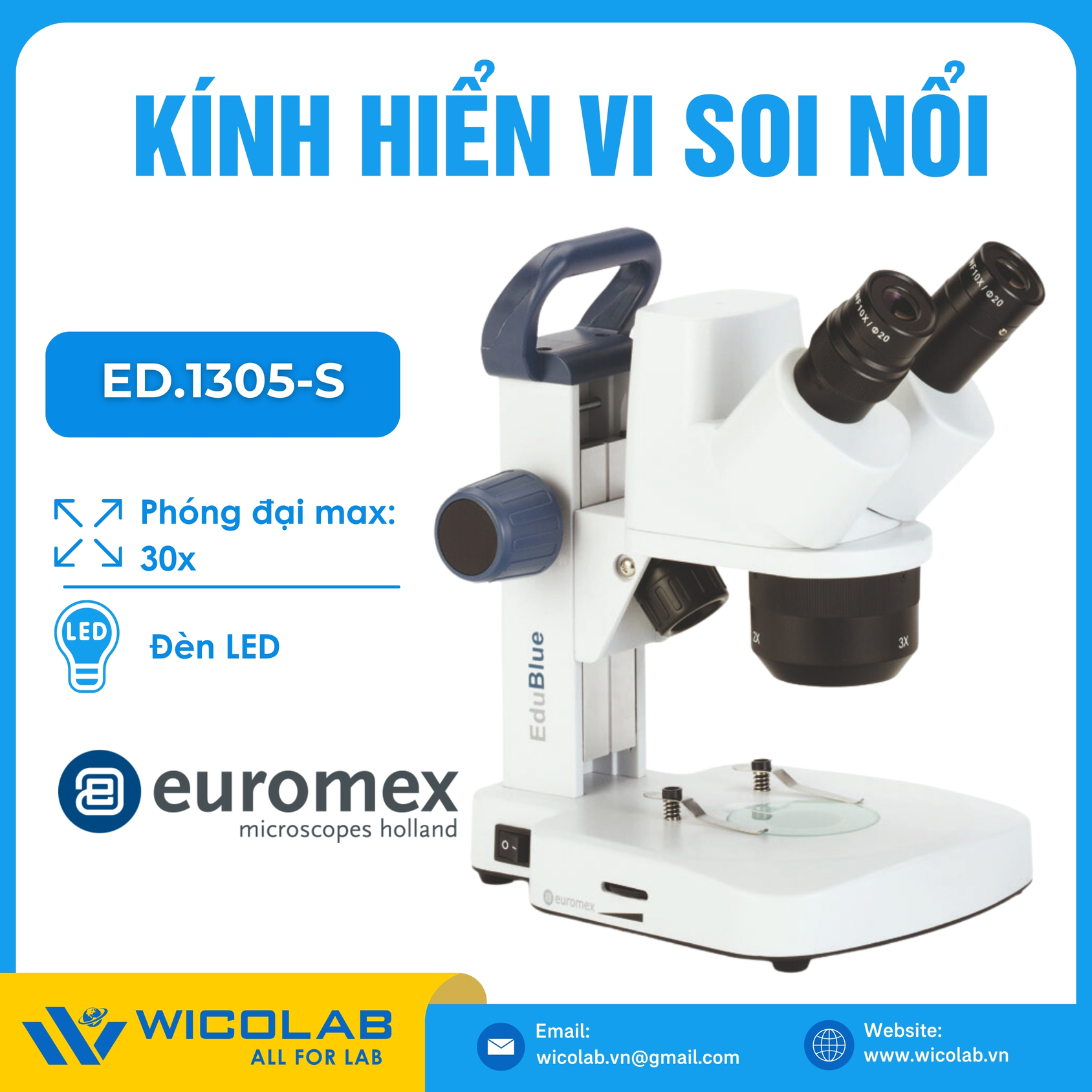 Kính hiển vi ED.1305-S EduBlue là loại kính hiển vi soi nổi do hãng Euromex- Hà lan sản xuất, tích hợp camera 3.2MP, được sử dụng rộng rãi trong các lĩnh vực: công nghiệp lắp ráp điện tử, kiểm tra dụng cụ thực phẩm, công nghệ sinh học, dược phẩm, thực phẩm...Sản phẩm được nhập khẩu và phân phối chính hãng bởi WICOLAB