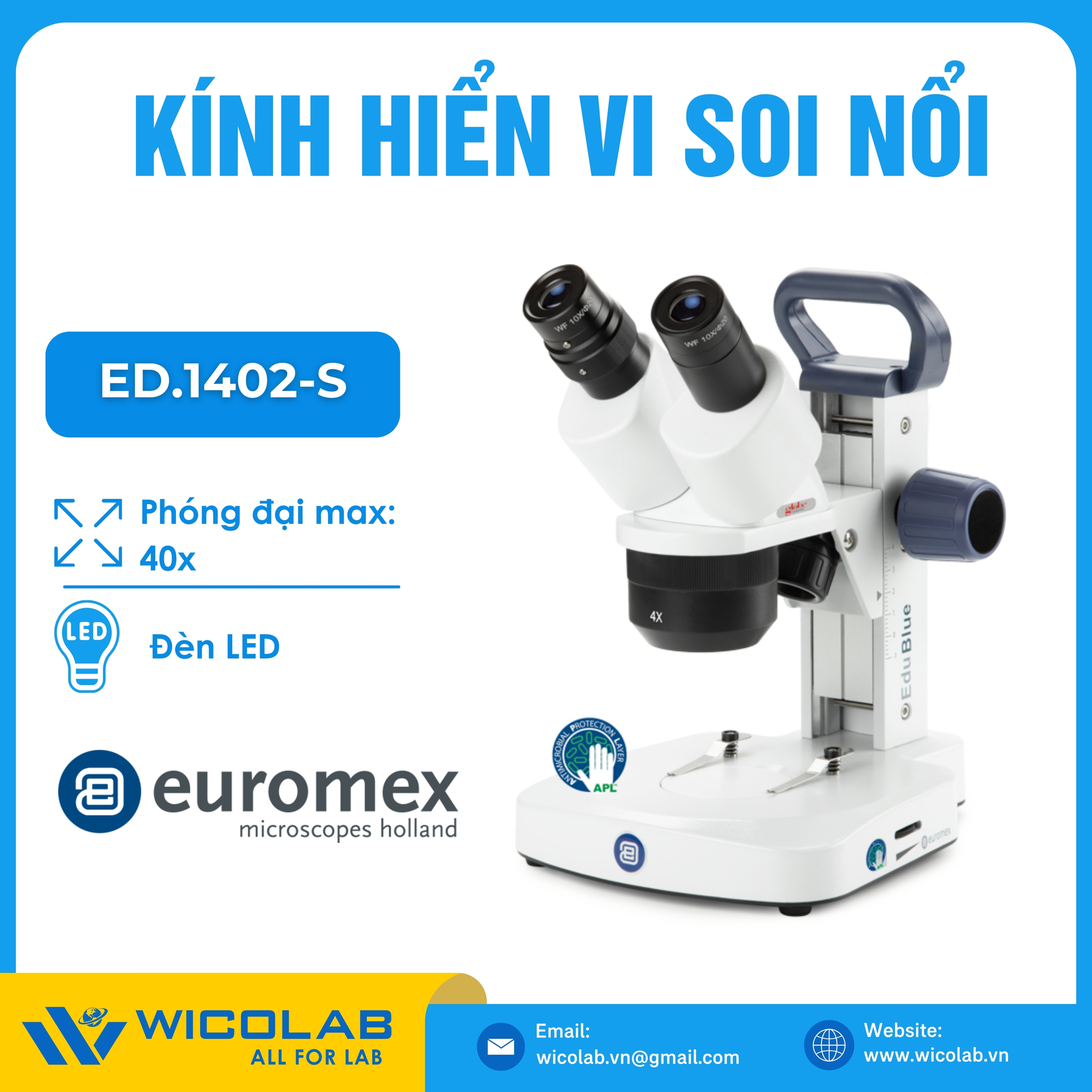 Kính hiển vi ED.1402-S EduBlue là loại kính hiển vi soi nổi do hãng Euromex- Hà lan sản xuất, độ phóng đại 20/40 lần, được sử dụng rộng rãi trong các lĩnh vực: công nghiệp lắp ráp điện tử, kiểm tra dụng cụ thực phẩm, công nghệ sinh học, dược phẩm, thực phẩm...Sản phẩm được nhập khẩu và phân phối chính hãng bởi WICOLAB