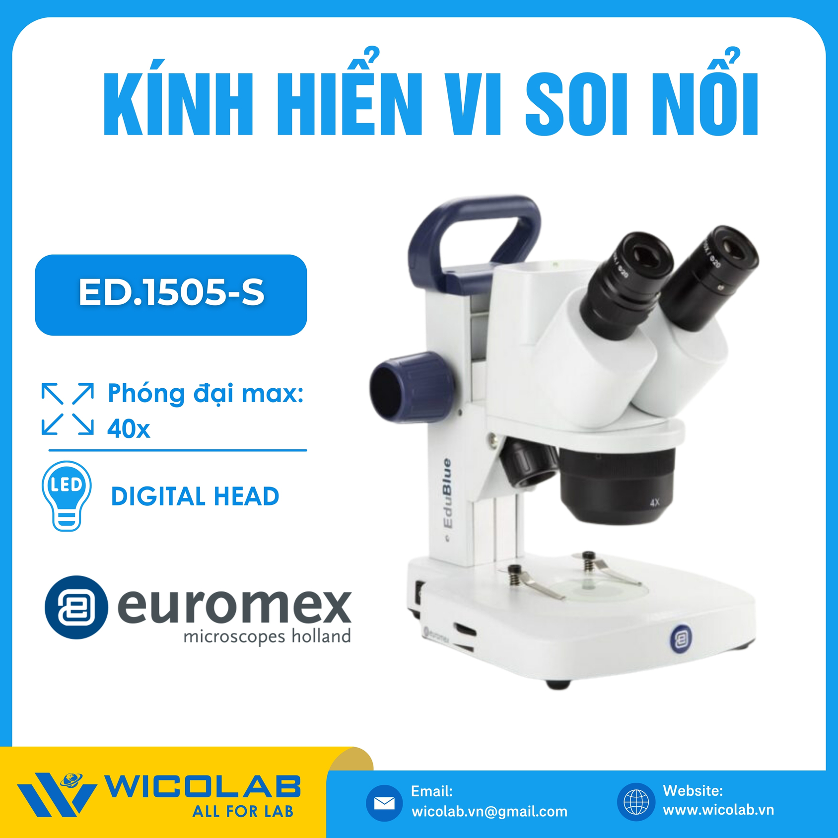 Kính hiển vi ED.1505-S EduBlue là loại kính hiển vi soi nổi do hãng Euromex- Hà lan sản xuất, Tích hợp Camera CMOS 3.2Mp kỹ thuật số, được sử dụng rộng rãi trong các lĩnh vực: công nghiệp lắp ráp điện tử, kiểm tra dụng cụ thực phẩm, công nghệ sinh học, dược phẩm, thực phẩm...Sản phẩm được nhập khẩu và phân phối chính hãng bởi WICOLAB
