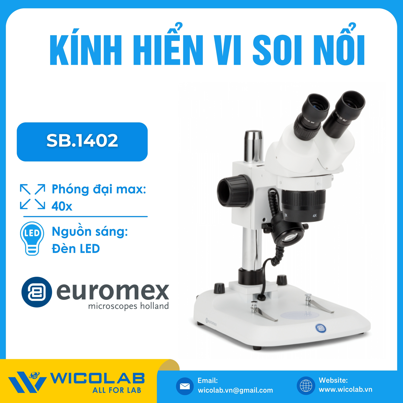 Kính hiển vi SB.1402 StereoBlue là loại kính hiển vi soi nổi do hãng Euromex- Hà lan sản xuất, độ phóng đại 20 đến 40 lần, được sử dụng rộng rãi trong các lĩnh vực: công nghiệp lắp ráp điện tử, kiểm tra dụng cụ thực phẩm, công nghệ sinh học, dược phẩm, thực phẩm...Sản phẩm được nhập khẩu và phân phối chính hãng bởi WICOLAB