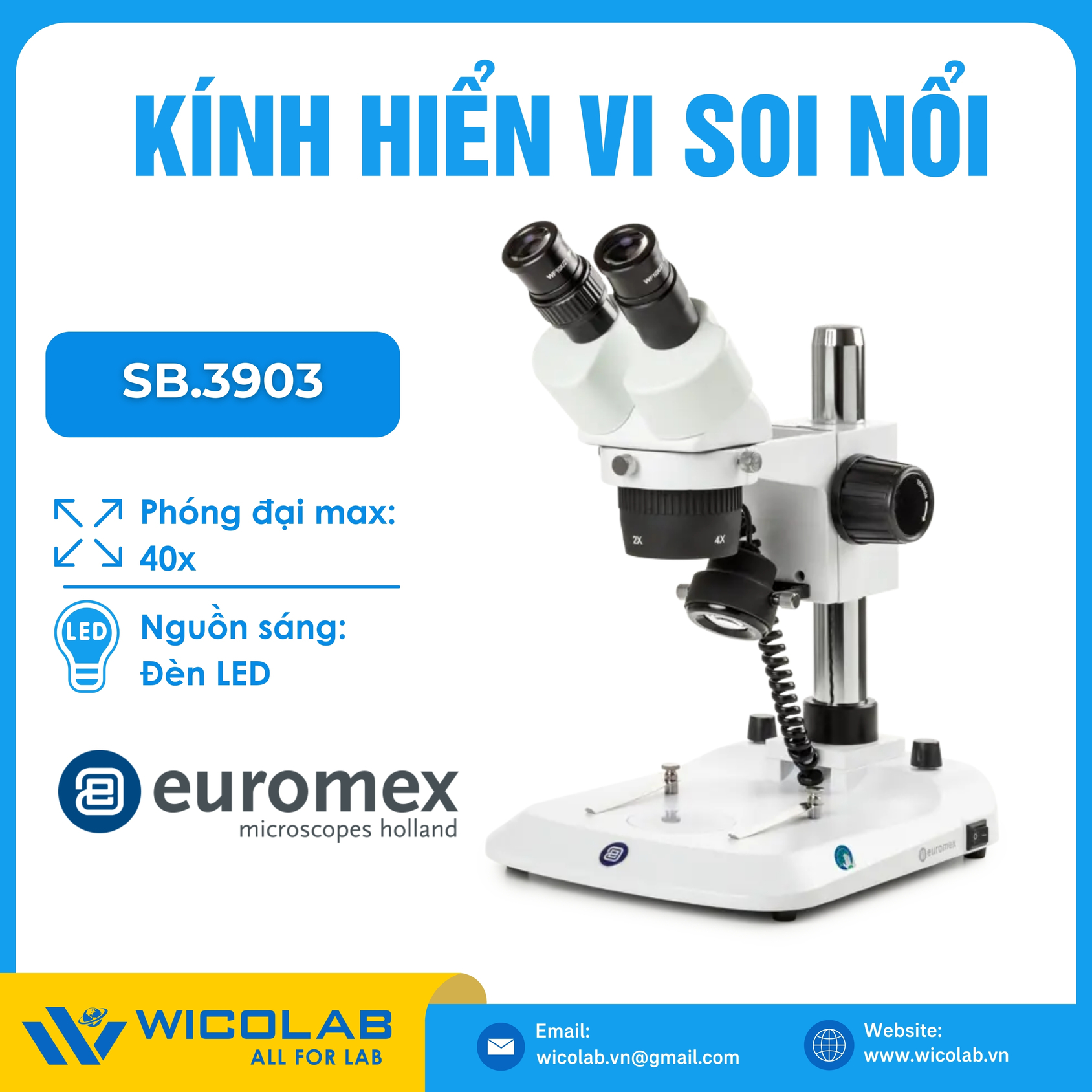 SB.3903 là Kính hiển vi StereoBlue là loại kính hiển vi soi nổi do hãng Euromex- Hà lan sản xuất, được sử dụng rộng rãi trong các lĩnh vực : công nghiệp lắp ráp điện tử, kiểm tra dụng cụ thực phẩm, công nghệ sinh học, dược phẩm, thực phẩm...Sản phẩm được nhập khẩu và phân phối chính hãng bởi WICOLAB