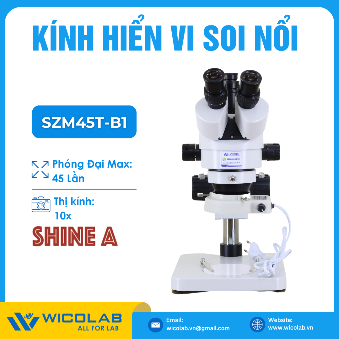 SZM45T-B1 ⭐ Kính hiển vi soi nổi 3 mắt cao cấp do hãng Shine A sản xuất. Sản phẩm được nhập khẩu và phân phối chính hãng bởi WICOLAB. Kính được thiết kế với 2 mắt quan sát và 1 vị trí gắn camera. Vật kính dạng zoom liên tục: 0,7 – 4,5x kèm thị kính 10x cho hình ảnh trực quan, sắc nét. Kính được sử dụng rất rộng rãi trong việc soi linh kiện, linh kiện điện tử