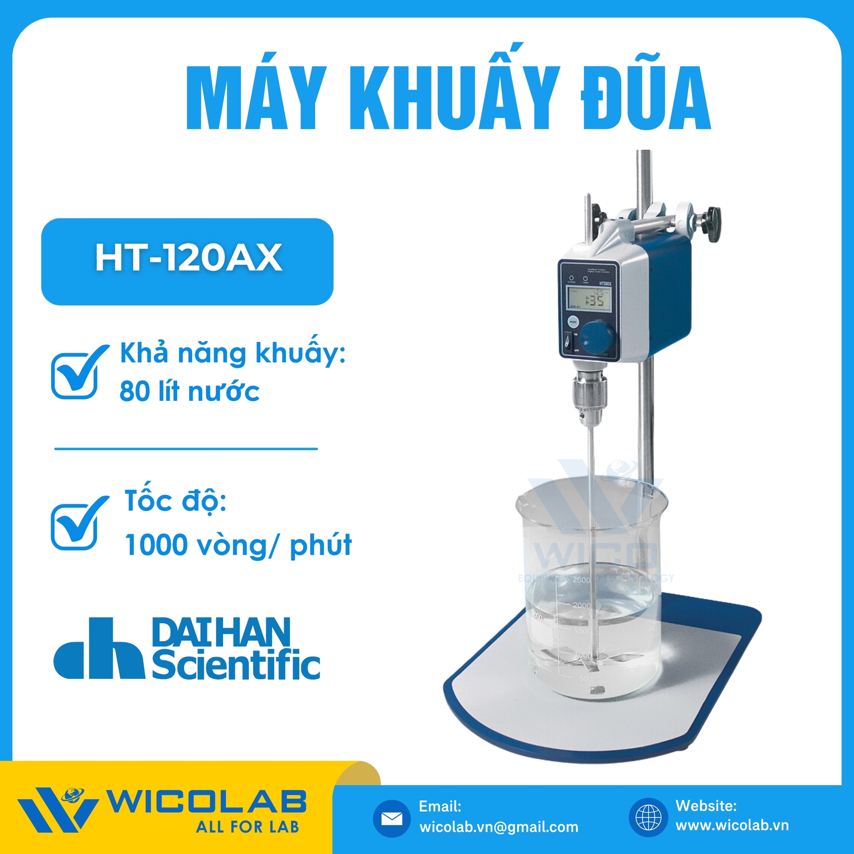 HT-120AX (Kiểu cơ) 🌟 Máy khuấy đũa chính hãng Daihan - Hàn Quốc. Khả năng khuấy tối đa 60 lít nước. Độ nhớt tối đa 90.000mPas. Tốc độ 50-1000 vòng/ phút. Sản phẩm được nhập khẩu và phân phối bởi WICOLAB. Bảo hành lên tới 12 tháng. Hỗ trợ giao hàng toàn quốc.