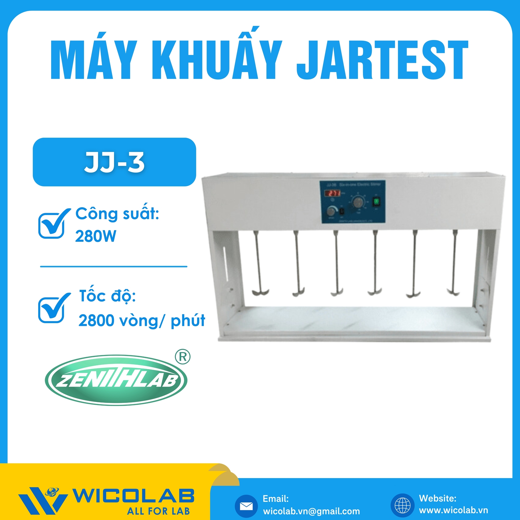 JJ-3 là máy khuấy đũa 6 vị trí thường được sử dụng khuấy Jartest cao cấp do hãng Zenith Lab thiết kế và chế tạo. Có thể thực hiện phép thử Jartest trong việc tách các chất ô nhiễm trong nước thải bằng phương pháp hóa lý (keo tụ tạo bông) ở quy mô phòng thí nghiệm một cách đơn giản và chính xác hơn. Được phân phối chính hãng bởi WICOLAB