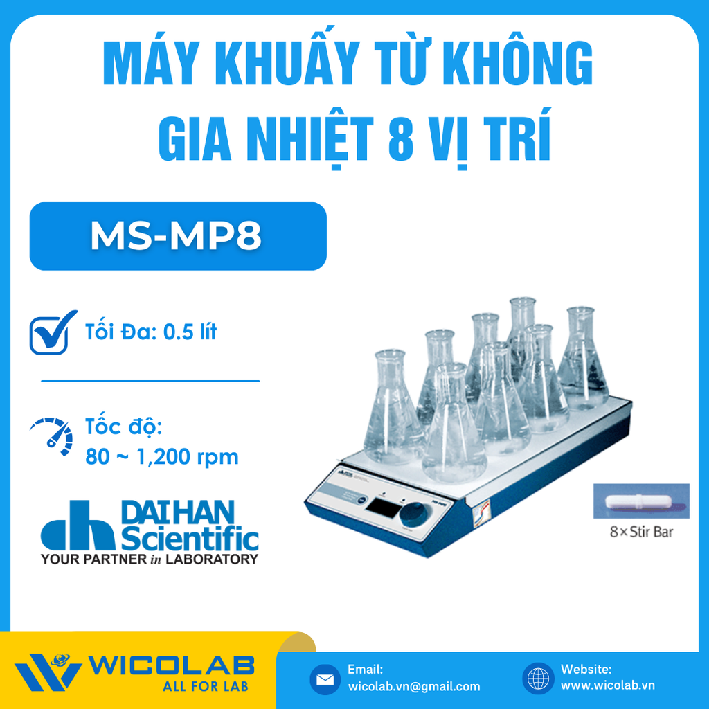 MS-MP8 ⭐ Máy khuấy từ không gia nhiệt 4 vị trí Tốc độ khuấy 80-1200 vòng/ phút. Mặt bếp 208x415mm bằng Inox 304, dễ vệ sinh. Sản phẩm do hãng Daihan - Hàn Quốc sản xuất, nhập khẩu và phân phố chính hãng bởi Wicolab. Bảo hành lên tới 12 tháng. Hỗ trợ giao hàng toàn quốc