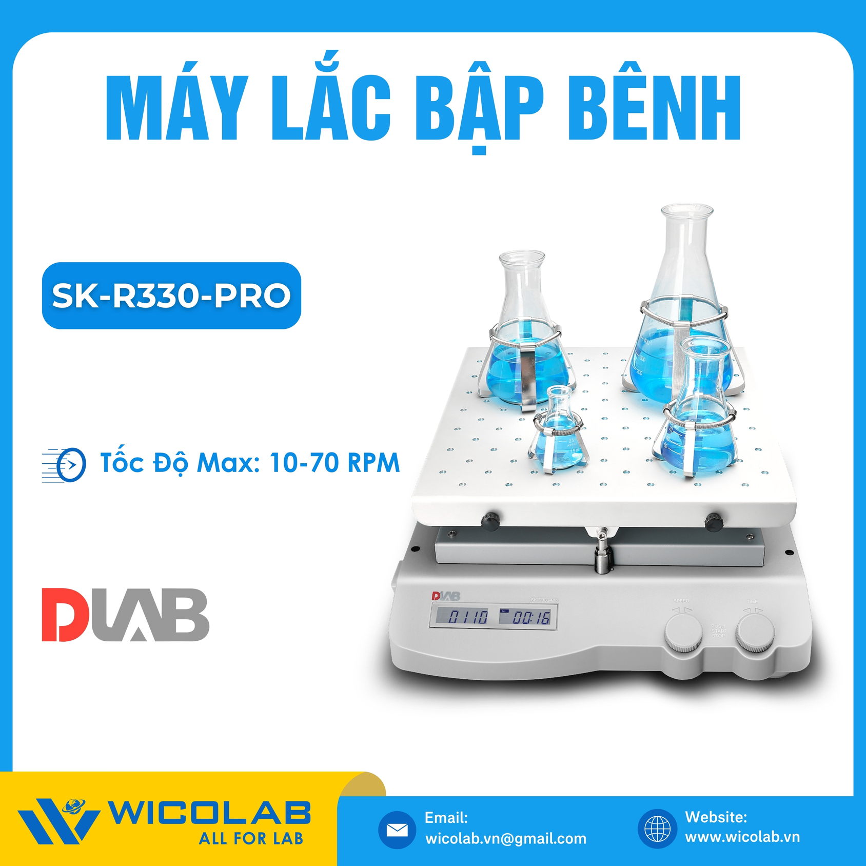 SK-R330-Pro🌟Máy lắc bập bênh do hãng Dlab - Trung Quốc thiết kế và chế tạo. Máy sử dụng động cơ DC hiệu suất cao có tải trọng tối đa 10kg (R330). Tốc độ tối đa 70/ 80 vòng/ phút. Máy sử dụng bộ điều khiển kỹ thuật số với màn hính LCD (R330). Bảo vệ quá tốc độ. Sản phẩm được nhập khẩu và phân phối chính hãng bởi WICOLAB