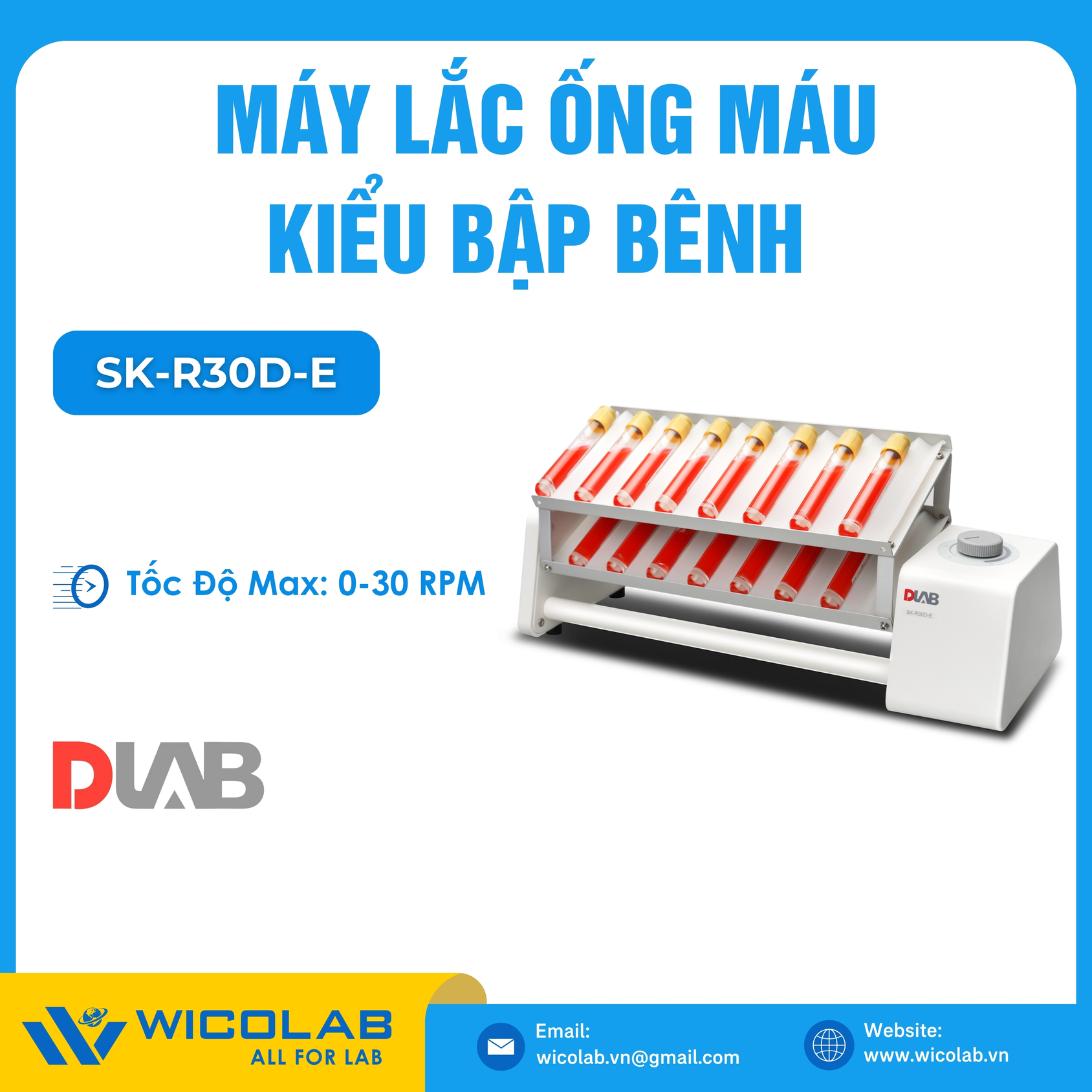 SK-R30D-E🌟Máy lắc ống nghiệm, ống máu kiểu bập bênh do hãng Dlab - Trung Quốc thiết kế và chế tạo. Máy sử dụng động co DC không chổi than hiệu suất cao. Không cần bảo trì. Với thiết kế nhỏ gọn đơn giản, điều khiển tốc độ 0-30 vòng/ phút. Thao tác dễ dàng với núm chỉnh tốc độ vô cấp. Sản phẩm được nhập khẩu và phân phối chính hãng bởi WICOLAB