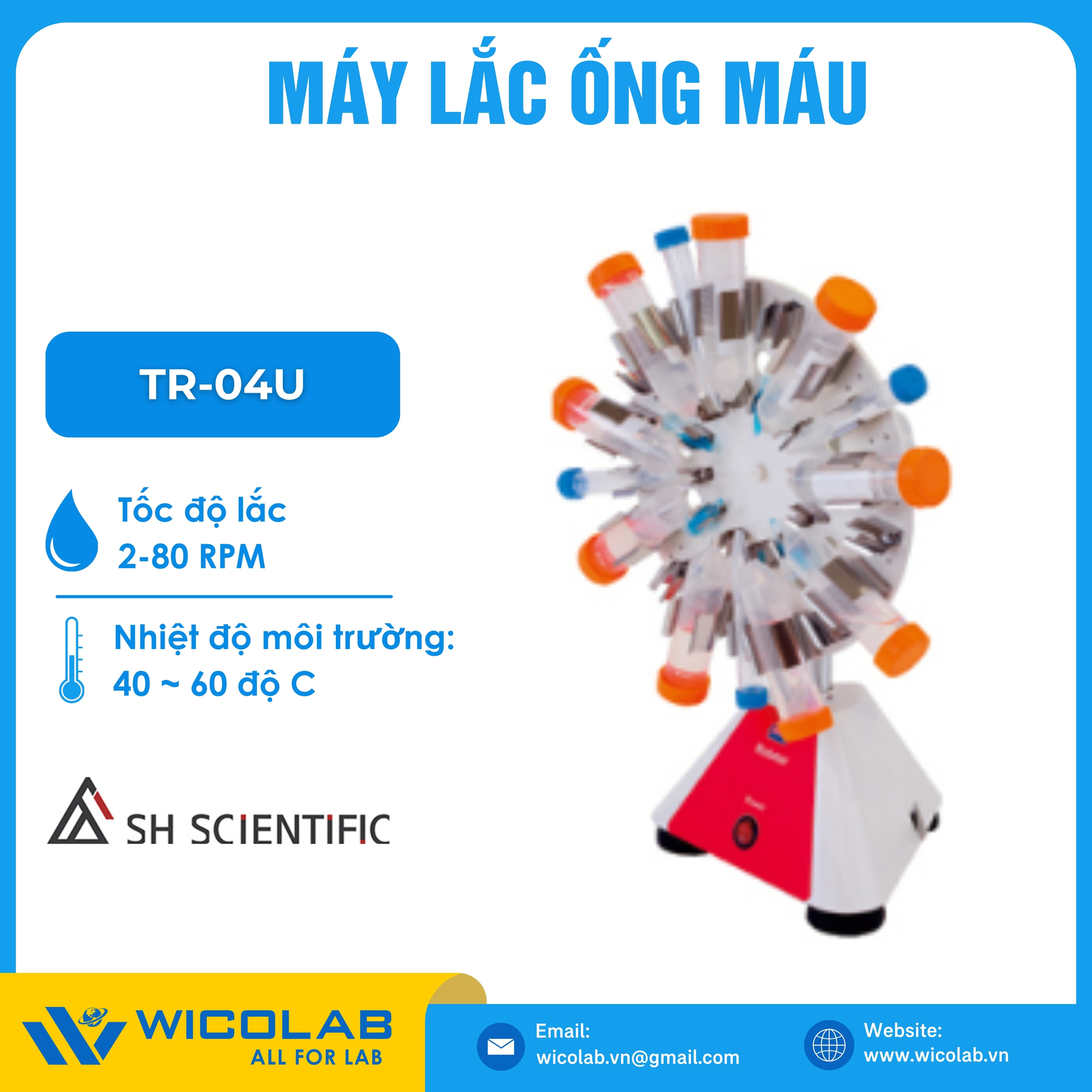 Máy Lắc TR-04U 🌟 Máy lắc ống máu kiểu xoay tròn - Rotator do hãng SH Scientific Hàn Quốc thiết kế và chế tạo với công suất tối đa: 12x50ml/ 18x15ml/ 48x2ml/ 9x50ml & 9x15ml & 12x2m. Tốc độ lắc đạt 20-80 vòng/phút. Sản phẩm được nhập khẩu và phân phối chính hãng bởi WICOLAB. Bảo hành theo tiêu chuẩn của hãng.