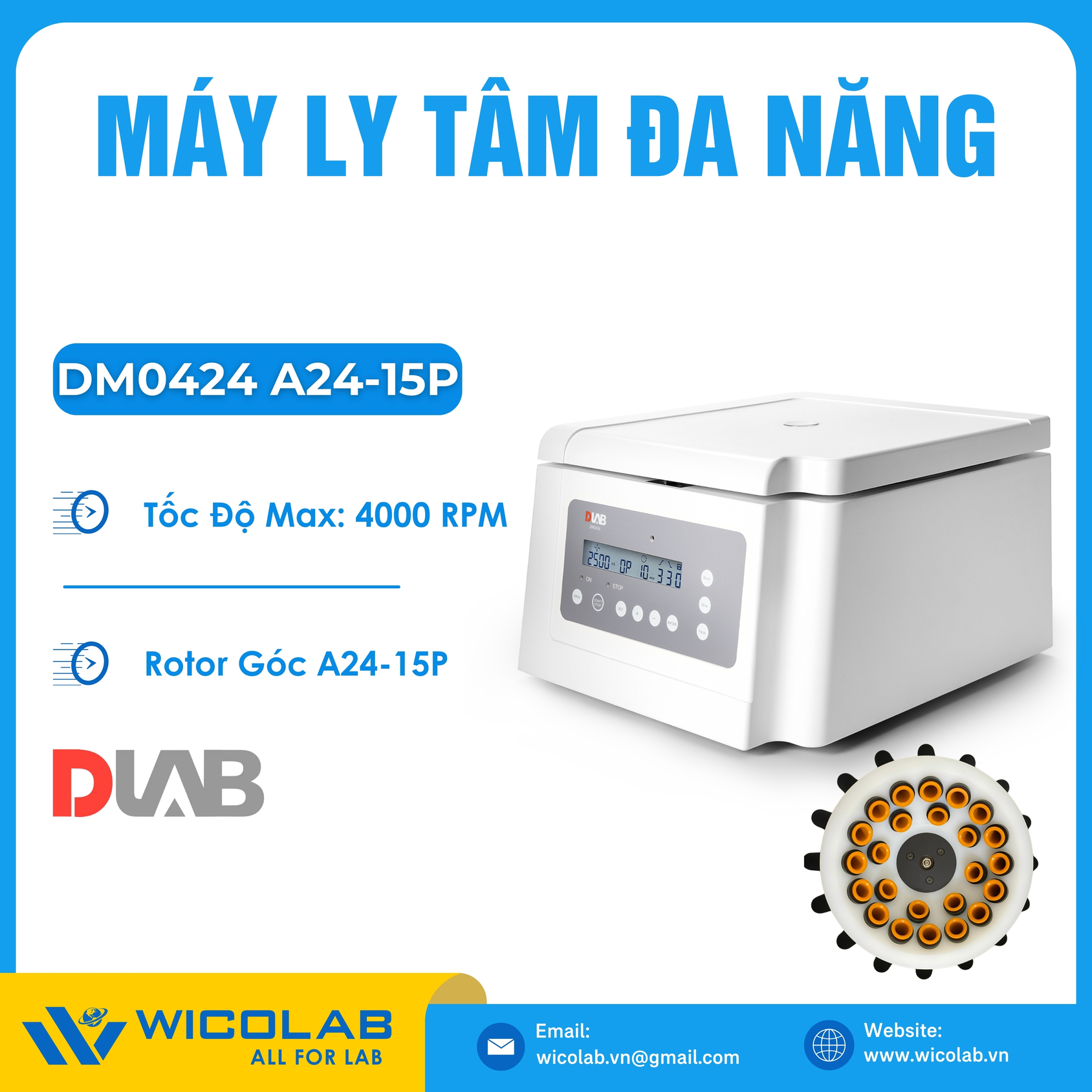 DM0424 🌟máy ly tâm đa năng do hãng Dlab - Trung Quốc thiết kế và chế tạo. Với dải tốc độ tối đa 4000 vòng/ phút, Bước tăng 100 vòng/ phút. Máy sử dụng động cơ DC không chổi than: Hiệu suất cao, có khả năng tăng tốc / giảm tốc nhanh và không cần bảo trì. Máy sử dụng bộ điều khiển hiện số màn hình LCD điều khiển chính xác tốc độ và thời gian. Nhập khẩu và phân phối chính hãng bởi Wico Việt Nam