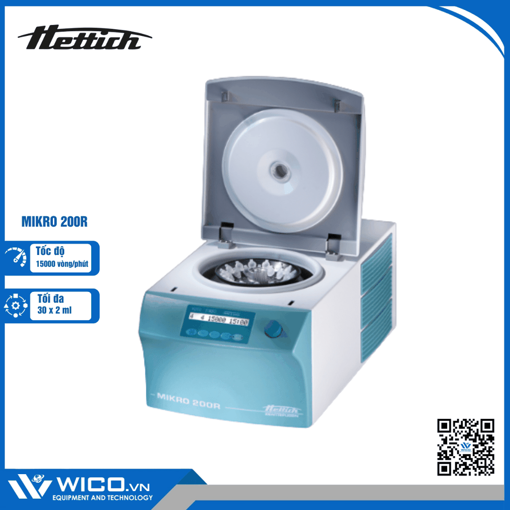 Mikro 200R🌟Máy ly tâm lạnh ống Micro 1.5/ 2.0ml do hãng Hettich - Đức sản xuất. Bộ điều khiển vi xử lý, cài đặt qua phím bấm các thông số điều khiển có thể chọn: tốc độ, thời gian ly tâm, nhiệt độ, cấp độ gia tốc, cấp độ giảm tốc, bán kính, lực ly tâm. Chức năng khoá nắp tự động. Sản phẩm được nhập khẩu và phân phối chính hãng bởi Wico Việt Nam.