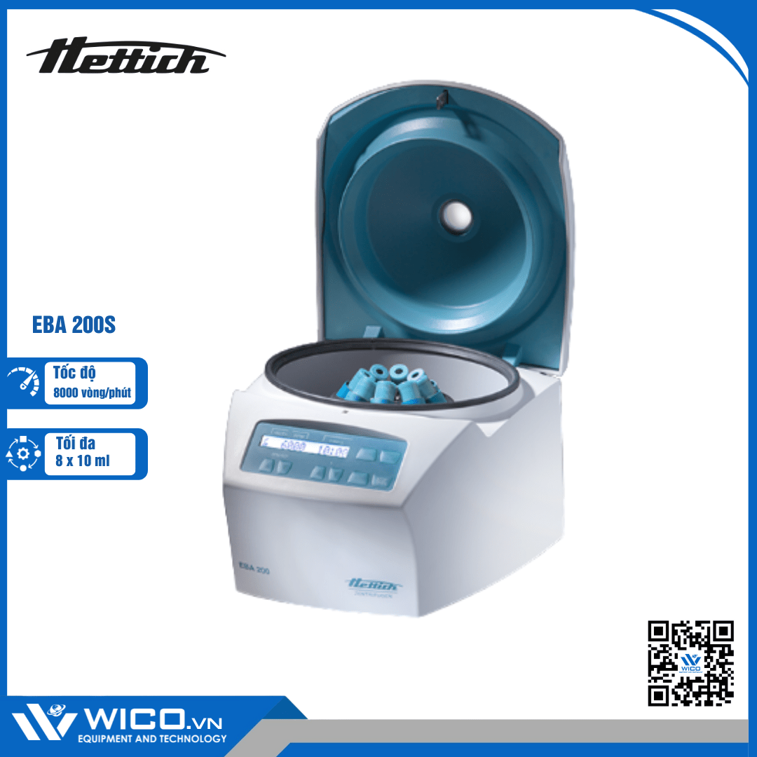 - EBA-200S là Máy ly tâm 8 ống tốc độ tối đa 8000 vòng/ phút kiểu để bàn do hãng Hettich - Đức thiết kế chế tạo. Máy còn có các đặc điểm ưu việt như hình thức bên ngoài đẹp, trọng lượng nhẹ, tiếng ồn nhỏ, rung động ít. Ngoài ra, thao tác máy rất thuận tiện, tính năng ổn định, sử dụng rất có hiệu quả. Máy có thể dùng trong các phòng hoá nghiệm của bệnh viện, các phòng thực nghiệm khoa sinh vật hay các phòng khám tư để tiến hành phân tích định tính huyết tương, huyết thanh và nước tiểu.