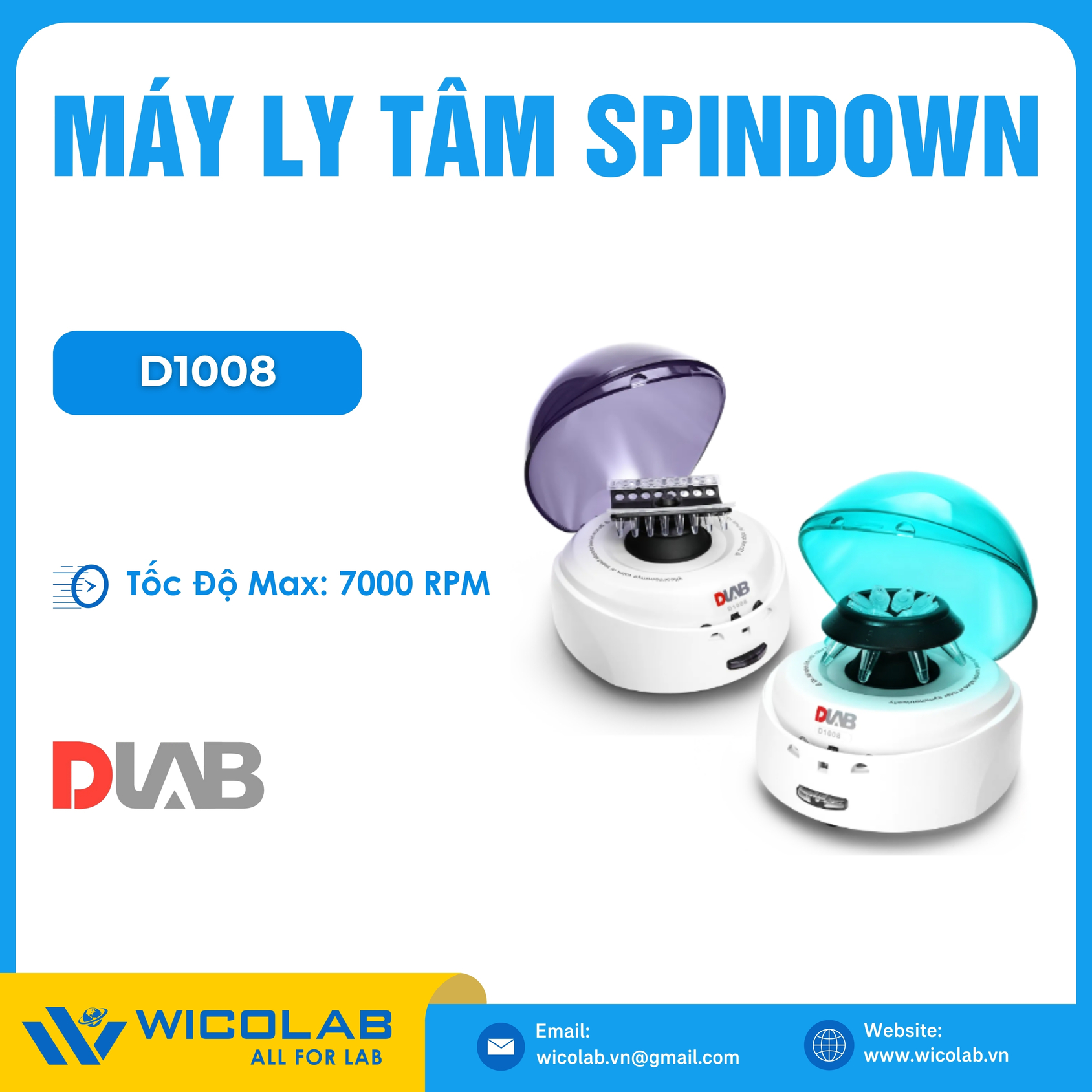 D1008 🌟Máy ly tâm Spindown do hãng Dlab - Trung Quốc thiết kế và chế tạo. Với thiết kế đơn giản và nhỏ gọn, máy cực kỳ dễ sử dụng và dễ dàng mang theo. Tốc độ tối đa lên tới 7000 vòng/ phút, động cơ DC Phù hợp cho ứng dụng ly tâm lắng nhanh (spindown) hoặc vi lọc. Nhập khẩu và phân phối chính hãng bởi Wico Việt Nam. Bảo hành lên tới 12 tháng.