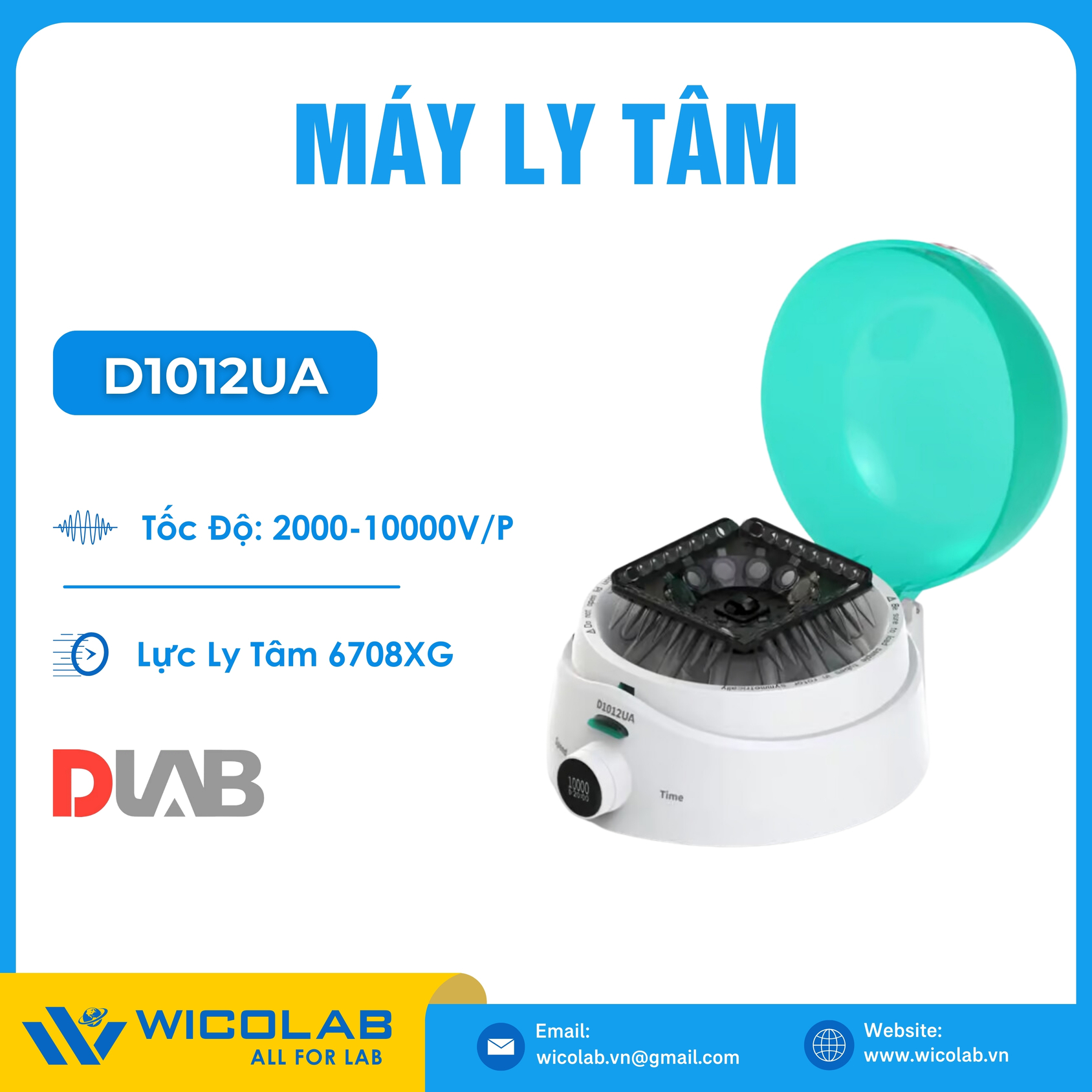 Máy ly tâm tốc độ cao D1012UA ⭐ hãng DLAB – Mỹ sản xuất. Máy ly tâm này lý tưởng cho việc quay nhanh (spin), vi lọc mẫu, tách tế bào và nhiều quy trình thí nghiệm thông thường khác. - Tốc độ tối đa 10,000 vòng/phút (7490xg) - Màn hình OLED, có thể chuyển đổi tốc. Sản phẩm được nhập khẩu và phân phối bởi WICOLAB