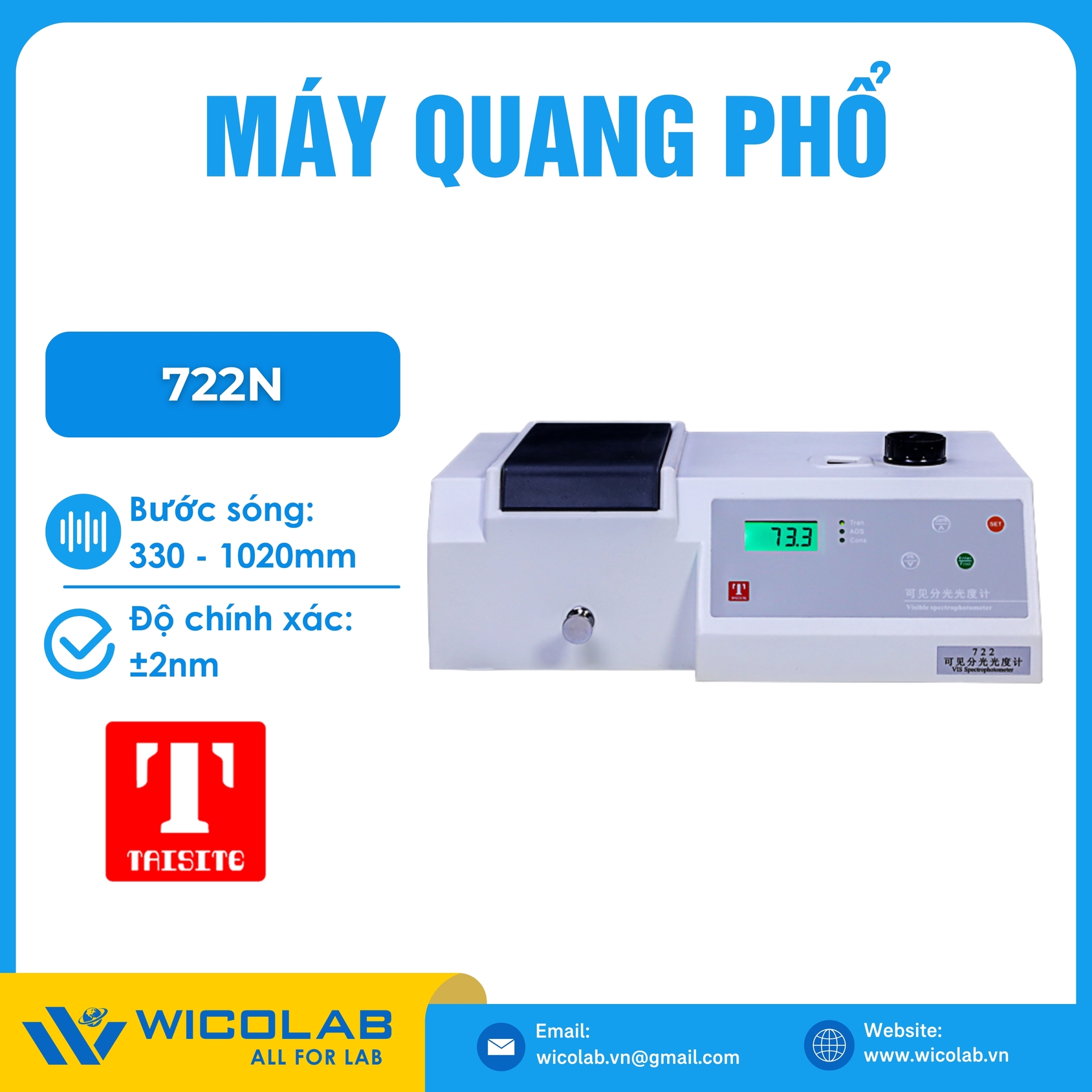 - 722 là Máy quang phổ so màu khả kiến do hãng Taisite Trung Quốc sản xuất được nhập khẩu và phân phối chính hãng bởi Wico
