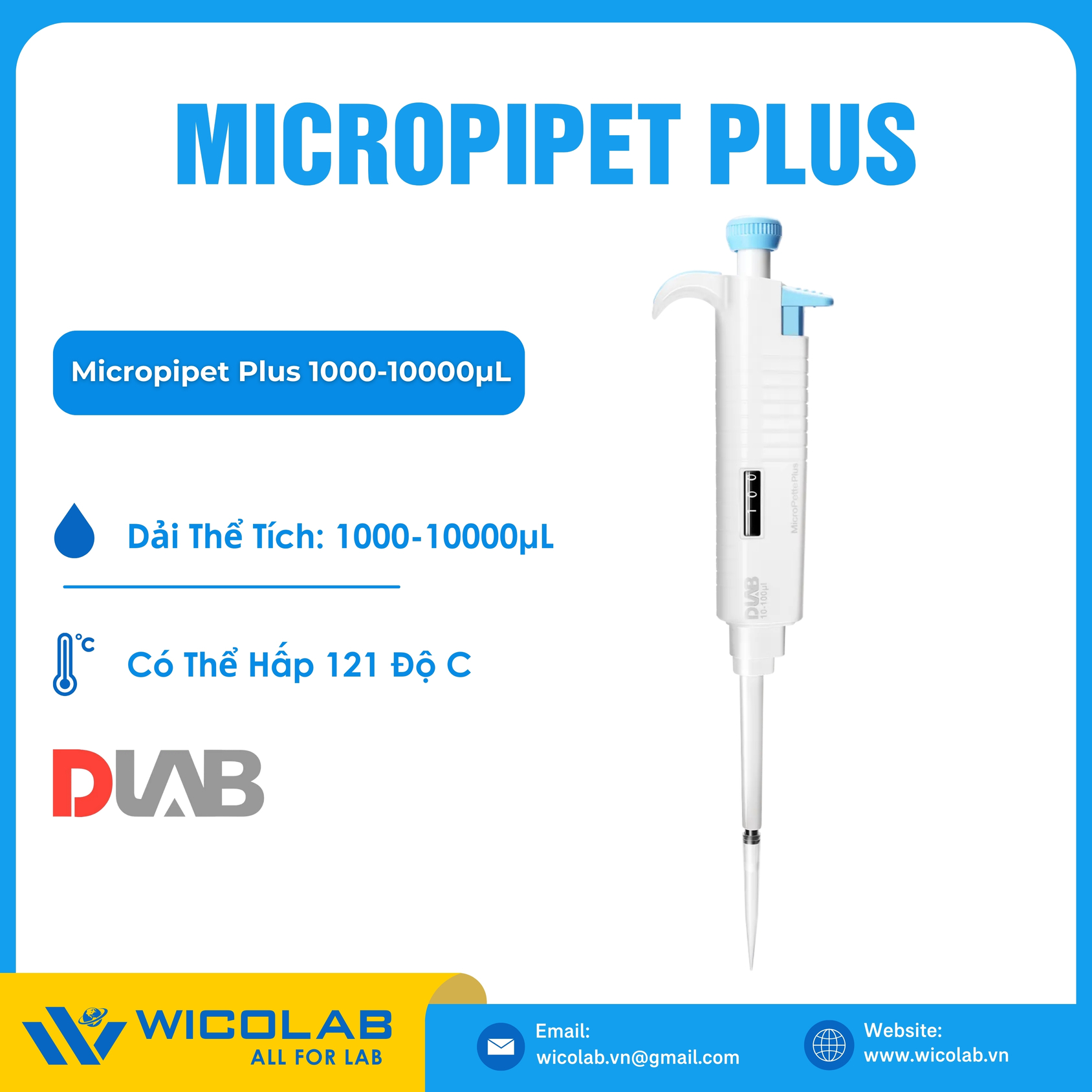 Micropipet Plus dải thể tích từ 1000-10000µL với bước tăng 10µL có thể hấp được ở nhiệt độ 121 độ C. Được nhập khẩu và phân phối chính hãng bởi WICOLAB. Hỗ trợ giao hàng toàn quốc