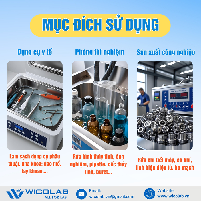 + Bể rửa siêu âm trong phòng thí nghiệm: Rửa ống nghiệm, pipette, cốc thủy tinh,…