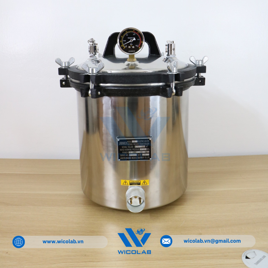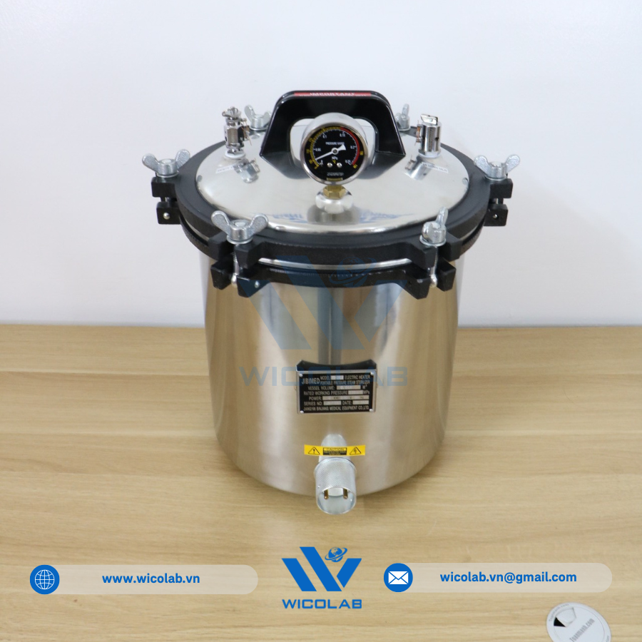 AC-24PM 🔥 Nồi hấp tiệt trùng xách tay giá rẻ với dung tích 24 lít do hãng Jibimed - Trung Quốc thiết kế chế tạo. Với dải nhiệt độ làm việc 126 độ C. Sản phẩm được thiết kế và chế tạo bởi hãng Jibimed - Trung Quốc. Nhập Khẩu và Phân Phối bởi Wicolab. Cam kết 100% sản phẩm chính hãng. Bảo hành lên tới 12 tháng. Hỗ trợ giao hàng toàn quốc.