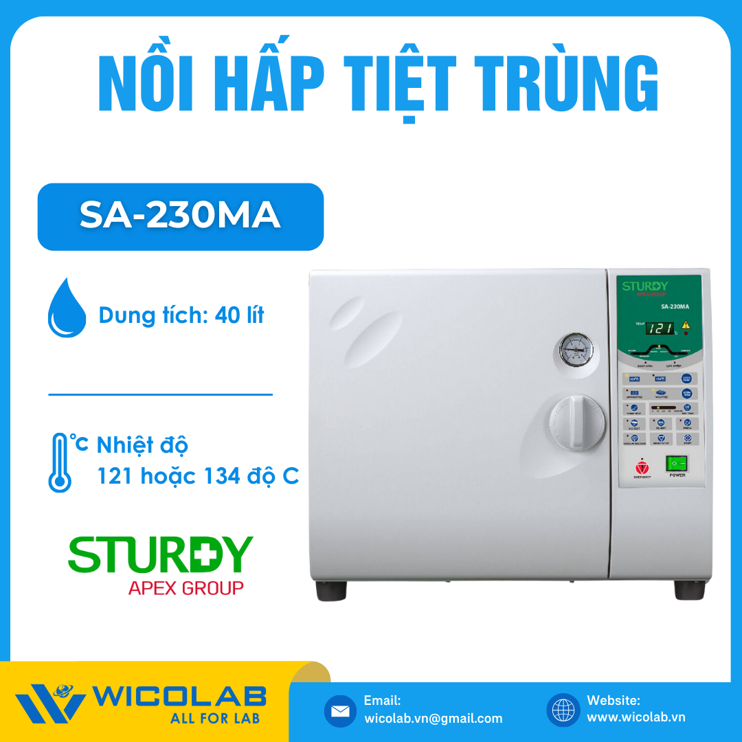 SA-230MA🌟Nồi hấp tiệt trùng để bàn sấy chân không tự động do hãng Sturdy (Đài loan) thiết kế và chế tạo. Với dung tích 16 lít, được thiết kế theo kiểu xách tay dễ dàng thao tác. Bộ điều khiển vi xử lý, cho phép điều khiển chính xác nhiệt độ, cài đặt các chức năng: chuẩn đoán, sấy khô, cài đặt trước các thông số tiệt trùng. Đặc biệt trang bị bơm chân không để tiệt trùng các vật liệu nhạy với nhiệt, cho độ đồng đều đặc biệt với các dụng cụ dạng ống. Nhập Khẩu và Phân Phối bởi Wicolab.