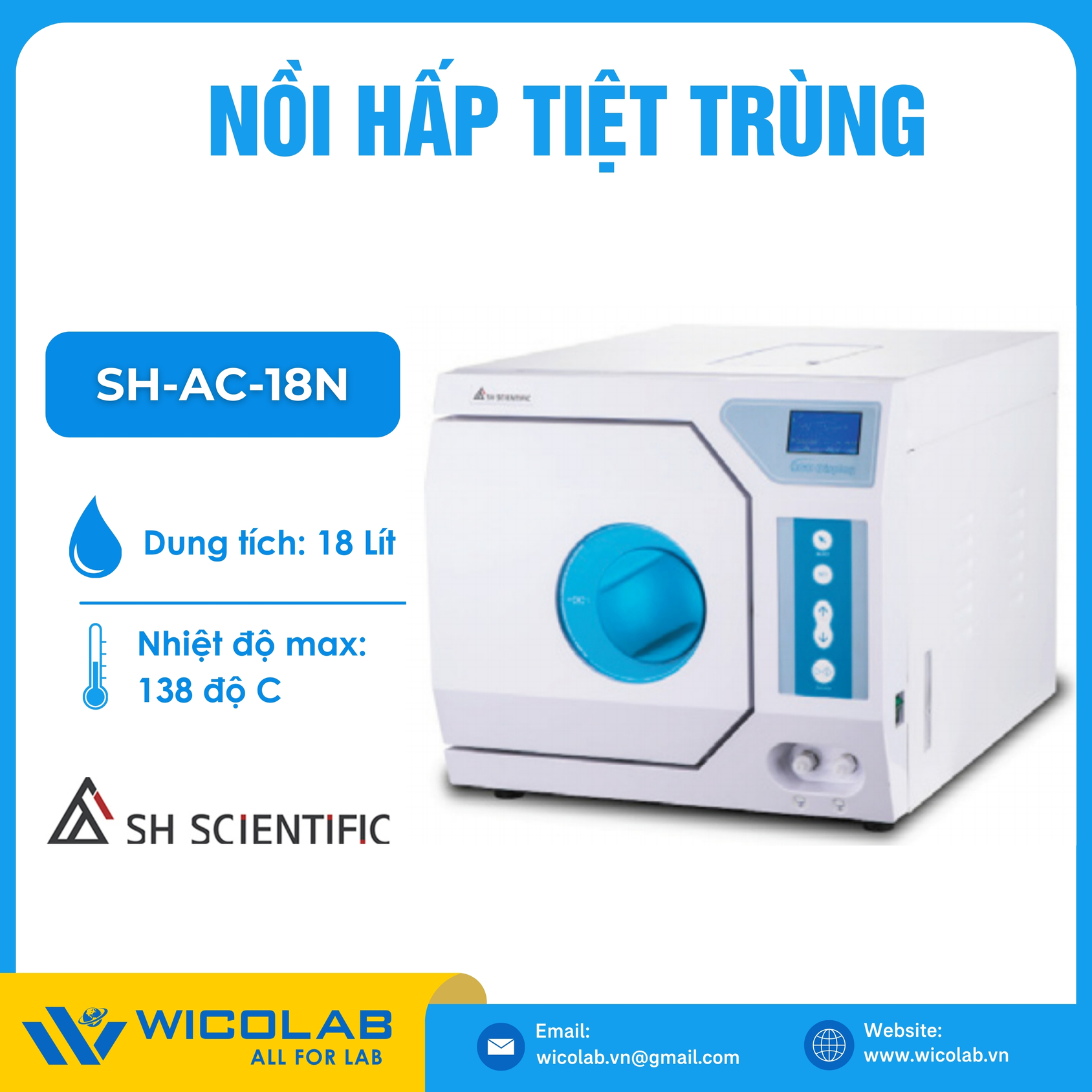 Nồi hấp SH-AC-18N 🌟 Nồi hấp tiệt trùng Class N. Sấy chân không tự động. Dung tích từ 18 lít. Sử dụng trong các phòng thí nghiệm, nhà máy trong lĩnh vực hóa học và các quá trình xử lý mẫu khác, yêu cầu áp suất và nhiệt độ cao như: vi sinh, dược phẩm, thú y, nấm men, nha khoa. Sản phẩm chính hãng SH Scientific Hàn Quốc. Được nhập khẩu và phân phối chính hãng bởi WICOLAB. Bảo hành lên tới 12 tháng. Hỗ trợ giao hàng trên toàn quốc