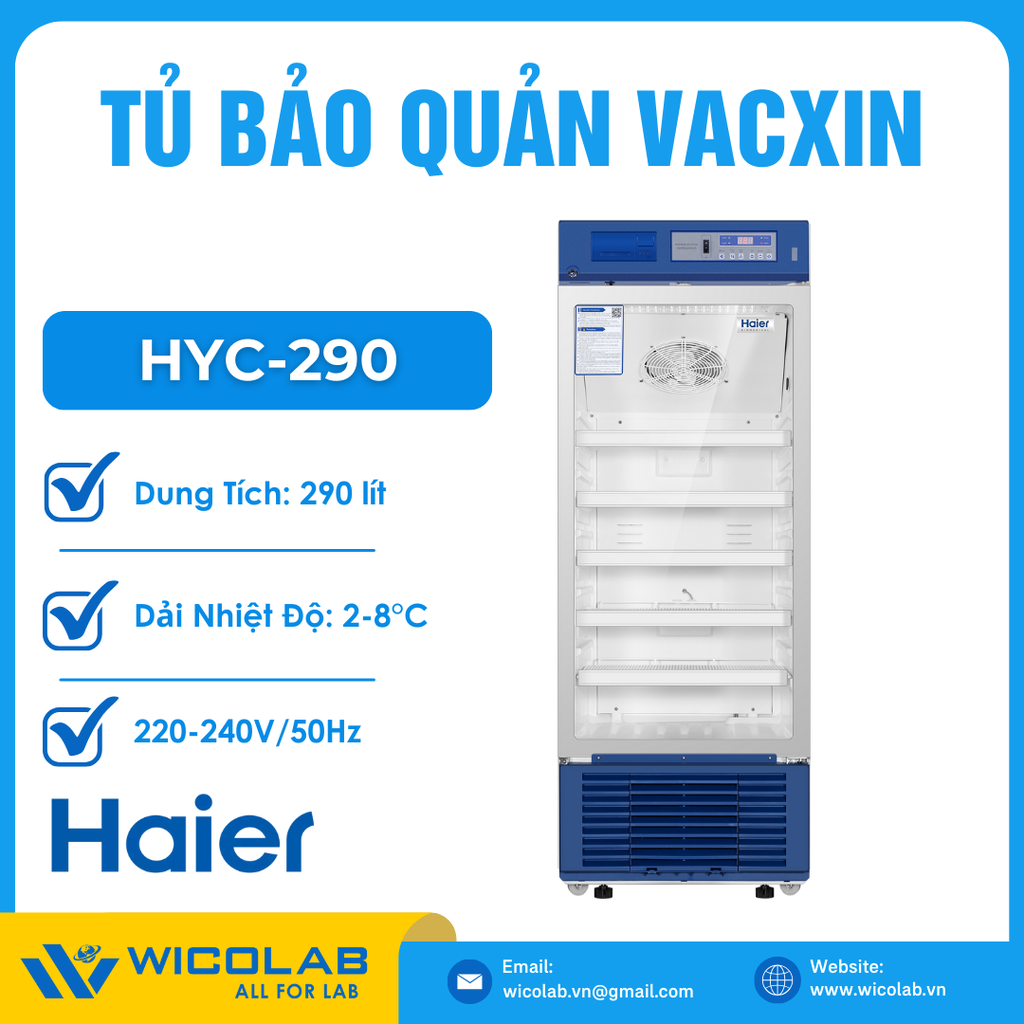 HYC-290 🌟 Tủ lạnh bảo quản dược phẩm/ vắc xin với dung tích 290 lít, thiết kể kiểu tủ đứng cửa kính. Dải nhiệt độ có thể điều chỉnh từ 2~8 độ do hãng Haier BioMedical thiết kế và chế tạo. Hệ thống làm lạnh dòng khí cưỡng bức đạt được độ đồng đều và ổn định nhiệt độ. Sản phẩm được phân phối chính hãng bởi Wicolab. Bảo hành lên tới 12 tháng. Hỗ trợ giao hàng toàn quốc.