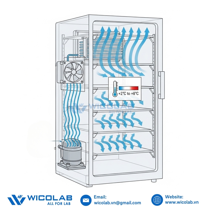 Khi bật tủ và hệ thống ổn định, sau khoảng 2–3 phút, máy nén sẽ bắt đầu hoạt động để làm lạnh. Luồng khí lạnh sau đó được quạt gió phân phối đều khắp khoang tủ, giúp duy trì nhiệt độ ổn định và đồng nhất trong toàn bộ không gian bảo quản.