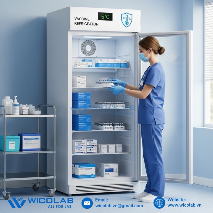 Tủ bảo quản vắc xin là thiết bị chuyên dụng giúp duy trì nhiệt độ ổn định (2–8°C), đảm bảo vắc xin không bị hư hỏng do biến động nhiệt.
