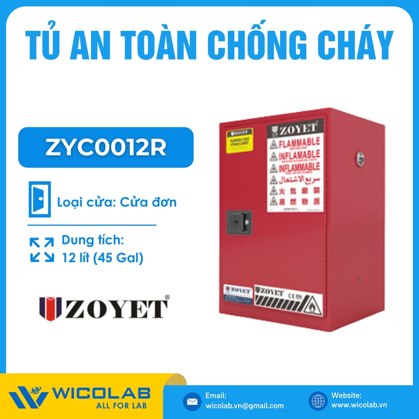 ZYC0012R ⭐ Tủ đựng hóa chất an toàn chống cháy 1 cửa dung tích 45 lít (12 Gal), phù hợp cho các loại mẫu có điểm cháy trên 37,8 độ C. Sản phẩm được sản xuất bởi hãng Zoyet – Trung Quốc. Được nhập khẩu và phân phối chính hãng bởi Wicolab. Bảo hành 12 tháng – Giao hàng toàn quốc