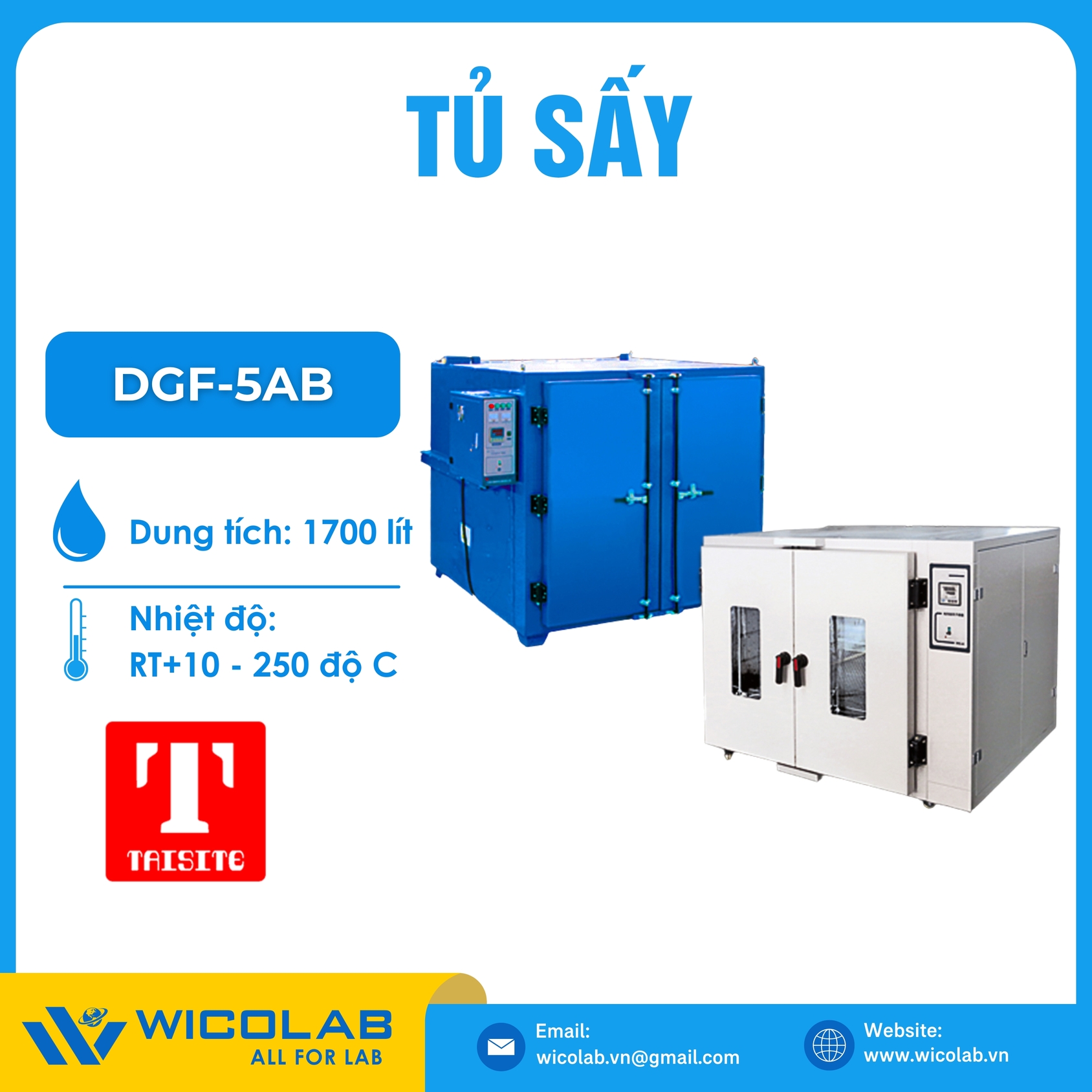 DGF-5AB 🌟 Tủ sấy để bàn dung tích 1700 lít, cửa kính 2 lớp - Quan sát mẫu dễ dàng, dải nhiệt độ +10 – 250 độ C. Sản phẩm được sản xuất bởi hãng Taisite - Trung Quốc, được nhập khẩu và phân phối chính hãng bởi WICOLAB. Bảo hành 12 tháng. Hỗ trợ giao hàng toàn quốc