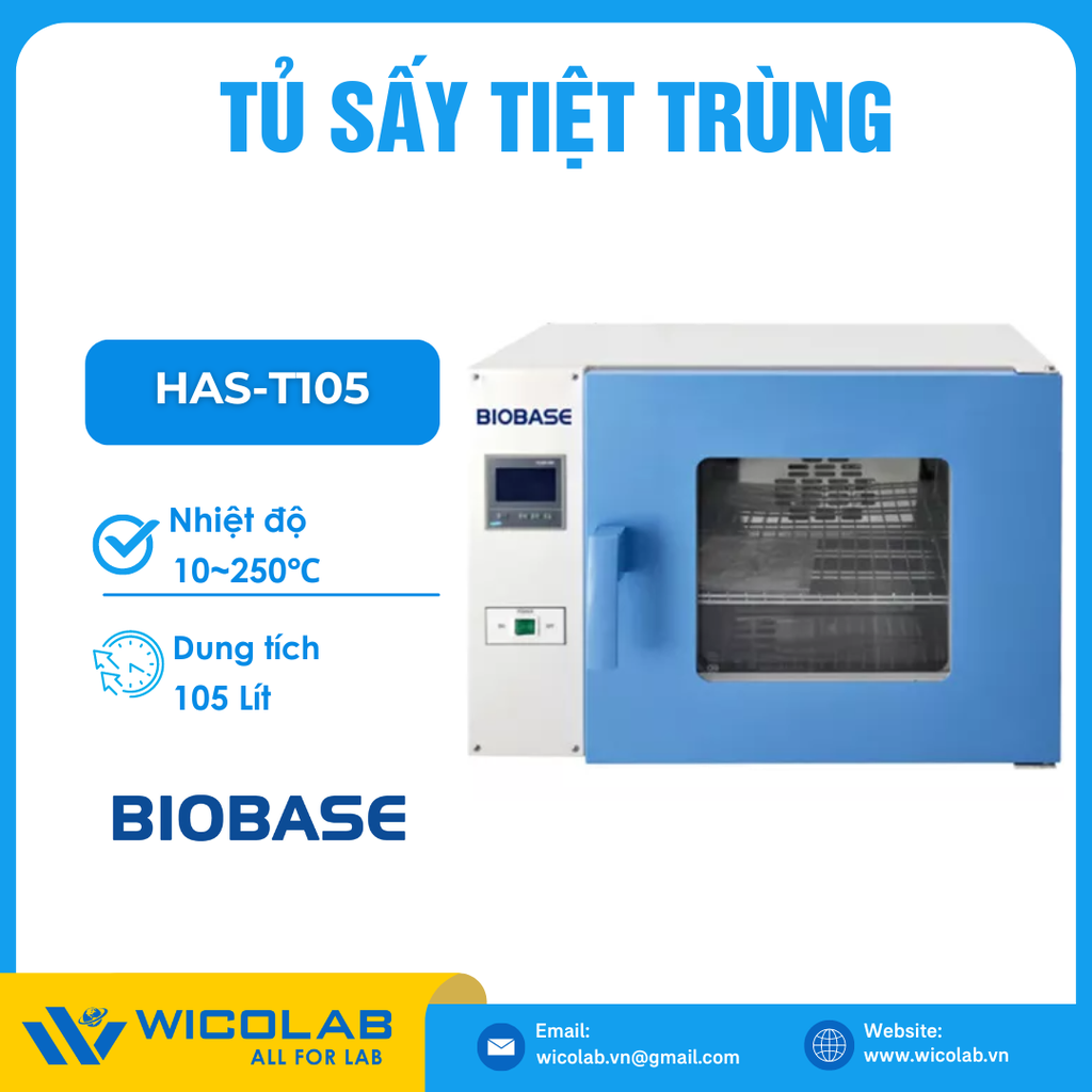 HAS-T105 🌟 Tủ sấy tiệt trùng nhiệt độ cao 105 lít. Với nhiệt độ tiệt trùng lên tới 250 độ C. Kiểm soát nhiệt độ bộ vi xử lý chính xác cao; Buồng bên trong bằng thép không gỉ 304. Sản phẩm do hãng Biobase thiết kế chế tạo, được nhập khẩu và phân phối chính hãng bởi Wicolab. Bảo hành 12 tháng