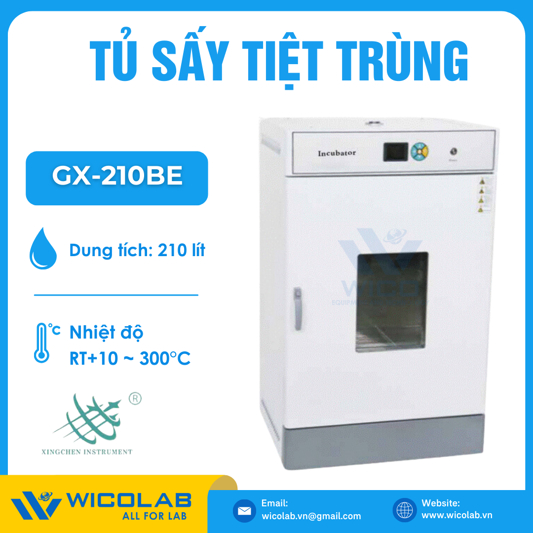 GX-210BE là Tủ sấy tiệt trùng không khí nóng dung tích 210 Lít do hãng Xingchen - Trung Quốc thiết kế và chế tạo. Tủ trang bị bộ điều khiển nhiệt độ thông minh PID và màn hình hiển thị LCD kiểm soát nhiệt độ thuận tiện và chính xác. Sản phẩm được nhập khẩu và phân phối chính hãng bởi Wicolab. Bảo hành lên tới 12 tháng, Hỗ trợ giao hàng trên toàn quốc